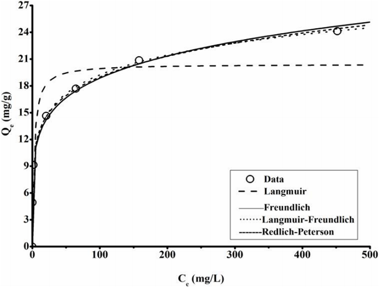 Langmuir, Freundlich, Langmuir-Freundlich, and Redlich-Peterson, four common models, were used to fit the isotherm experimental data to explore how the adsorbate is distributed from the liquid to the solid phases under an equilibrium condition.