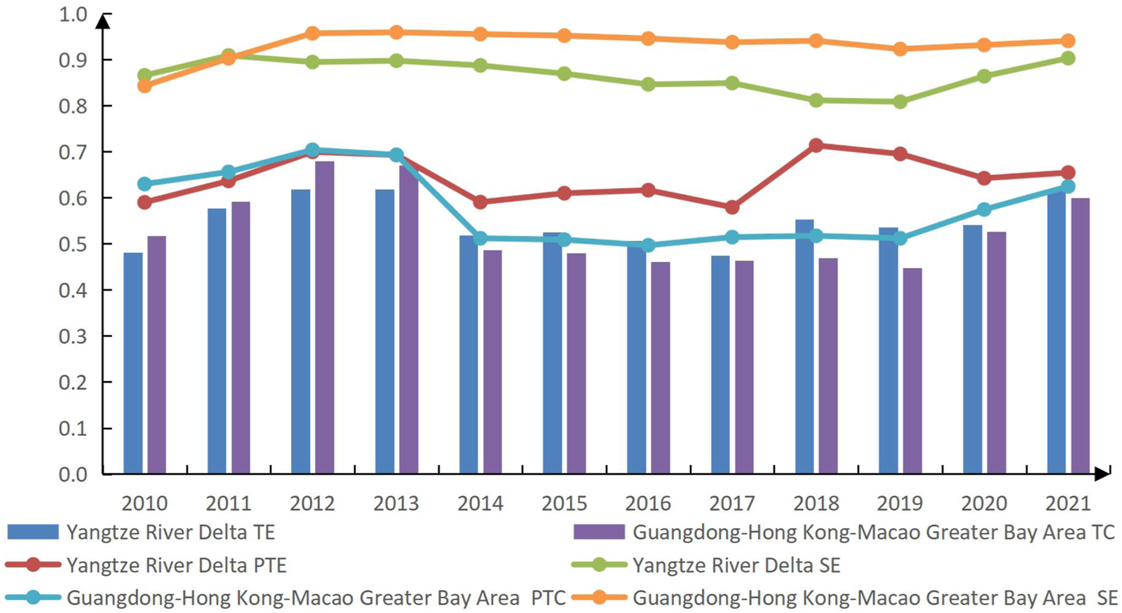 The annual mean variation of carbon emission efficiency in the Yangtze River Delta and the Guangdong–Hong Kong–Macao Greater Bay Area urban agglomeration from 2010 to 2021 is shown in Figure 2. The changes of technical efficiency and comprehensive efficiency show a trend of homogeneity, which indicates that technological progress is the main internal driving force for the improvement of urban carbon emission efficiency (Liu et al., 2018). The carbon emission efficiency shows a steady growth trend on the whole, most of which distributes the low-efficiency stage (0.4 and 0.6), proving that the Yangtze River Delta and the Guangdong–Hong Kong–Macao Greater Bay Area urban agglomeration bears the mission of balancing economic growth and low-carbon development, and science and technology would become the core driving force for building the future urban carbon emission reduction system.