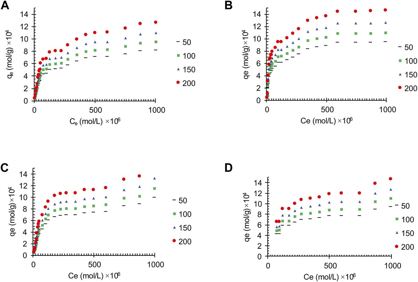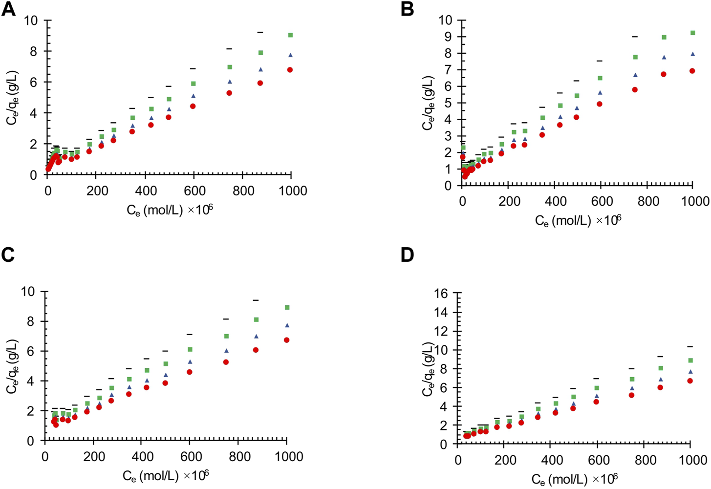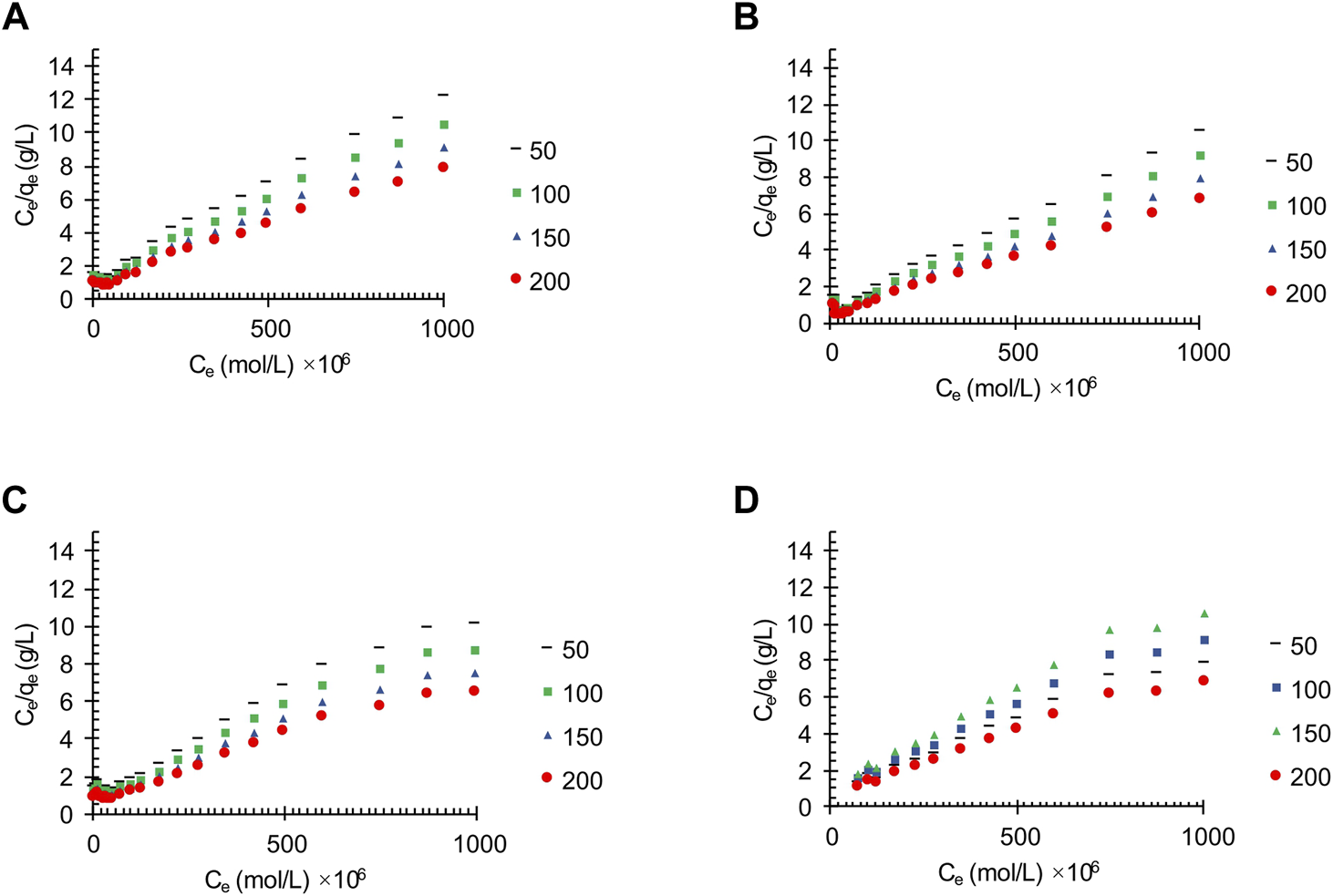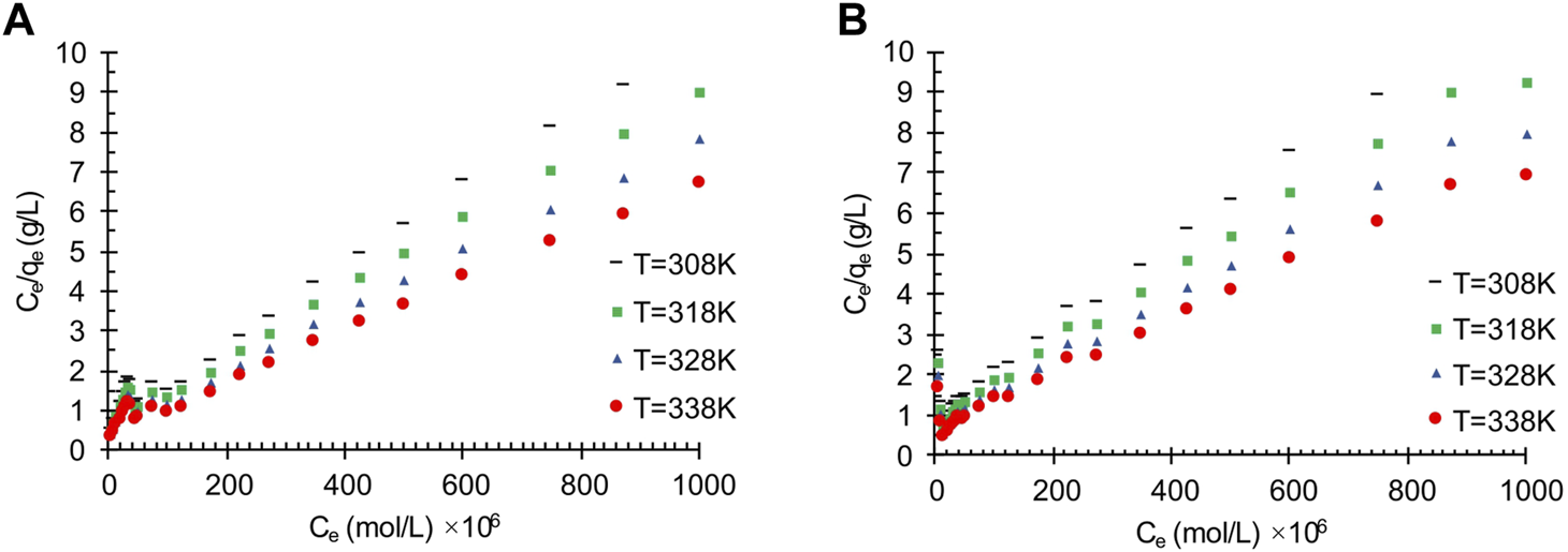 In Eq. 1, Kl is the Langmuir constant, Ce is the equilibrium concentration, and qm is the maximum capacity of the adsorption process; so, the validity of the Langmuir model can be obtained using a linear plot of Ce/qeversus Ce.
