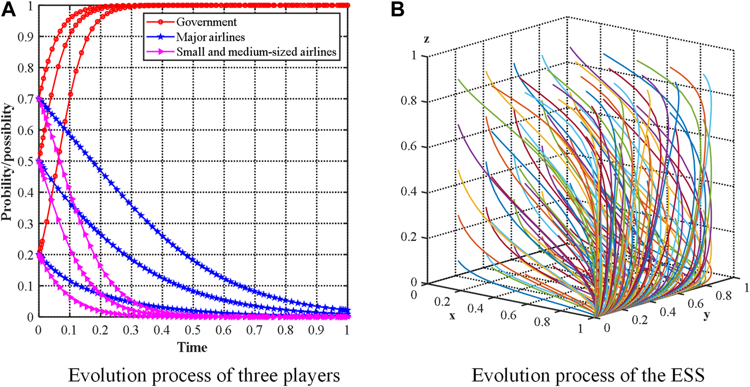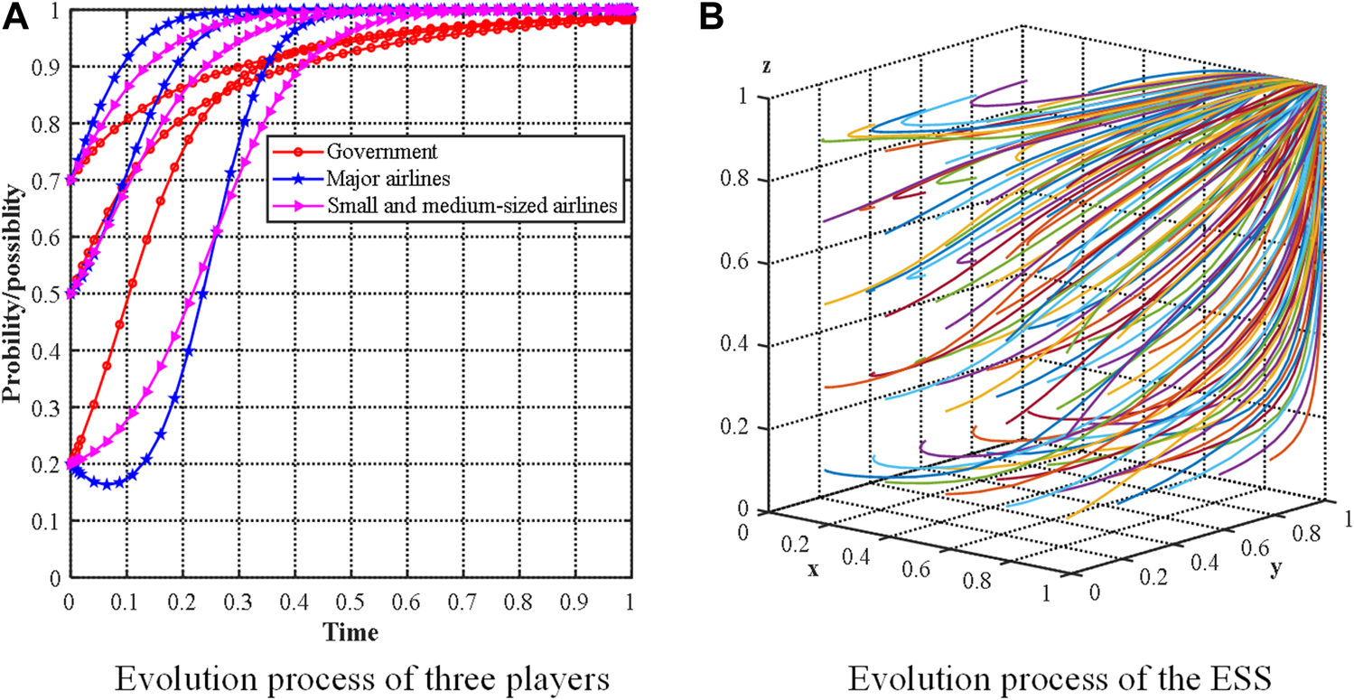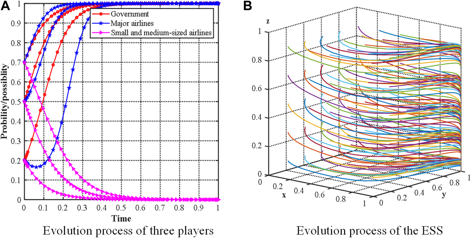 Evolutionary game theory has an undeniable advantage in regulating carbon emissions (Jiang et al., 2019; Wang et al., 2021). Jiang et al. study the dynamics of players’ decisions to reconcile the conflicting interests between the governments and shipping companies to better the environment in coastline areas. This plays a crucial part in the emissions abatement behavior of governments and maritime enterprises, as well as in policy development (Jiang et al., 2020). Chong and Sun note that evolutionary game theory is a powerful tool that could help the central government solve the twin dilemmas of environmental protection and economic growth (Chong and Sun, 2020). Similarly, Meng et al. analyzed the evolutionary path of the choice of emissions abatement strategies of the governments, port companies and maritime companies, and investigate the mechanisms influencing the choices of players (Meng et al., 2022). Based on an evolutionary game, the above study analyzes only two or three parties’ dynamic game relationships. However, no evolutionary game studies have emerged to address a hybrid emission reduction mechanism. Thus, this paper systematically and comprehensively investigates the mechanism of low-carbon behavior between the government and airlines under a hybrid mechanism.