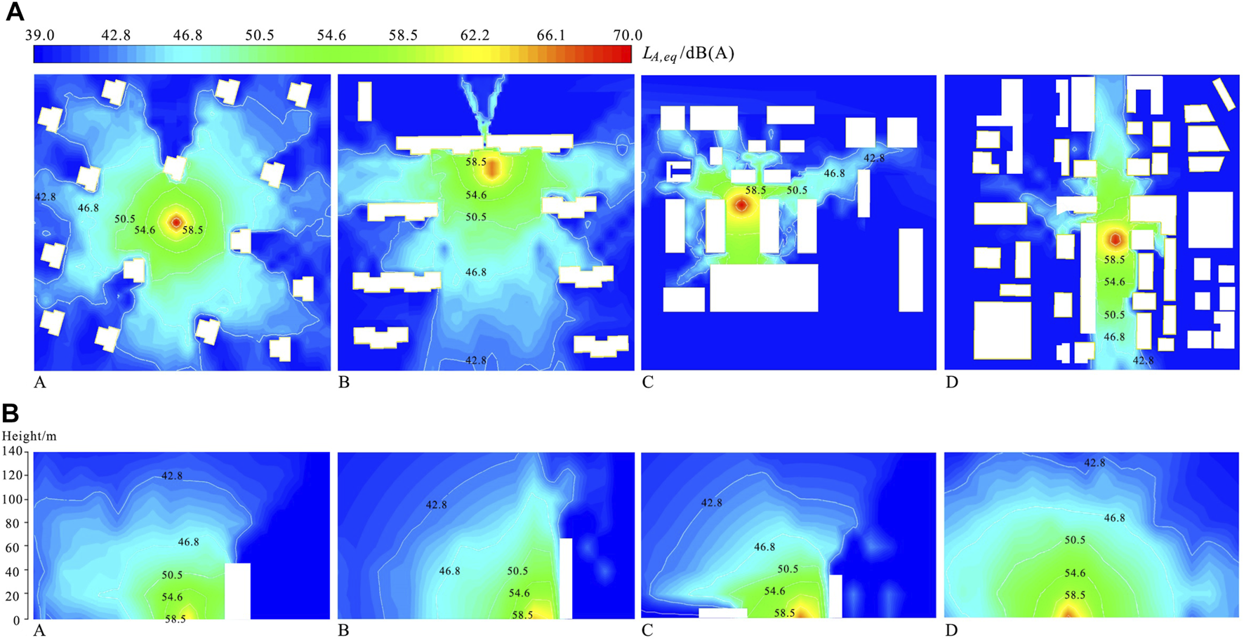(A) Averaged and (B) maximum noise levels at different heights on façades with sound-reflecting building envelopes in the four sample sites.