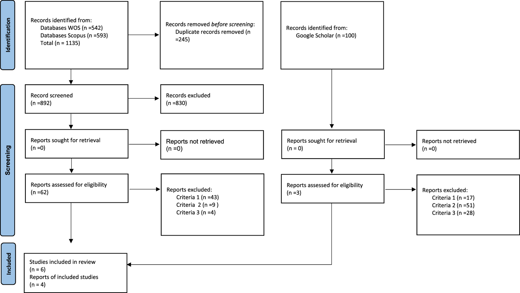 These searches resulted in a total of 1,135 articles on WOS and SCOPUS; they were exported into the reference management software, Zotero, and duplicates were removed, resulting in 892 original articles. After an abstract screening, 62 articles were identified. A full-text screening determined that six articles met the inclusion criteria. In addition to utilizing the Web of Science (WOS) and Scopus databases, Google Scholar was also employed as an external database to augment the inclusion of relevant scholarly articles. Given a large number of Google Scholar results (over 100,000 entries, including grey literature), only the first 100 articles from each search were screened, as per Haddaway et al. (2015). Three articles out of those 100 determined by the search query met the inclusion criteria.