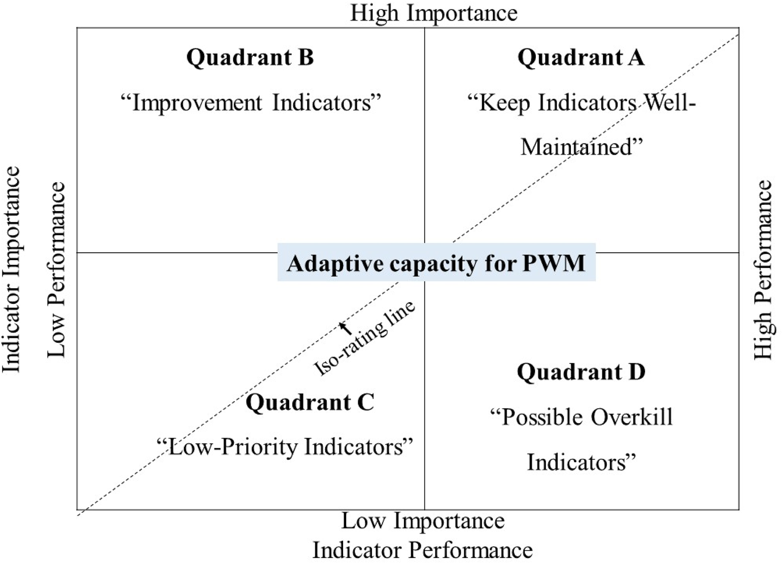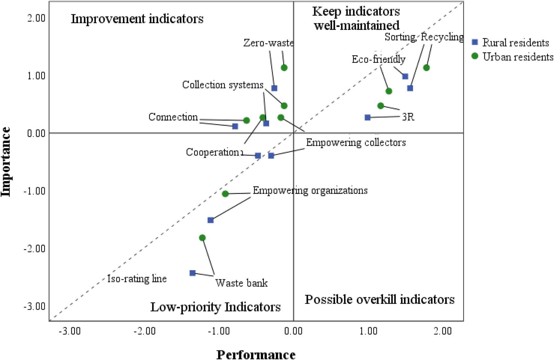 Upon cleaning the data, they were entered and analyzed with the Statistical Packages for Social Sciences (version 26; SPSS Statistics Inc., Chicago, IL, USA). The data analysis involved three main steps. Initially, a pairwise t-test was executed to conduct a gap analysis with the purpose of identifying the degree of alignment between performance and importance perceptions (Chen et al., 2021; V. V. Nguyen et al., 2021). This is measured as performance minus the importance of indicators. A positive gap indicates that the perceived performance of the indicator was equal to or greater than its perceived importance. Conversely, a negative gap indicates that the indicator’s perceived performance was lower than its perceived importance. Afterward, IPA was carried out using I-P grids to display indicators, as outlined by Martilla and James (1977). The IPA model, illustrated in Figure 3, consists of four quadrants that signify four distinct strategies, with performance depicted on the x-axis and importance on the y-axis. Quadrant A, referred to as “keep indicators well-maintained”, contains indicators with a high level of performance and a high level of importance. The recommended strategy is to maintain the current system. Quadrant B, known as “improvement indicators”, includes indicators with a performance level below the average (low). Focus should be placed on the improvement of the indicators in this quadrant. The low priority C quadrant consists of indicators that residents consider unimportant, and their performance is likewise perceived as low, leading them to be identified as “low-priority indicators”. Improvements in the C quadrant are not given much priority. Quadrant D, known as “possible overkill indicators”, contains indicators with a high-performance rating, however residents do not consider these attributes important enough. Therefore, instead of focusing on this attribute, it is recommended that resources be diverted to other indicators that require them more. An alternative way of categorizing attributes is to use an upward diagonal line at a 45-degree angle, known as an ‘iso-rating’ or ‘iso-priority’ line, to designate management priorities. Items that fall directly on the line suggest that their level of performance matches their level of importance. However, items positioned above the line suggest that their performance is inadequate in relation to their level of importance and require improvement (Bacon, 2003; Boley et al., 2017; Ahmed, 2021).