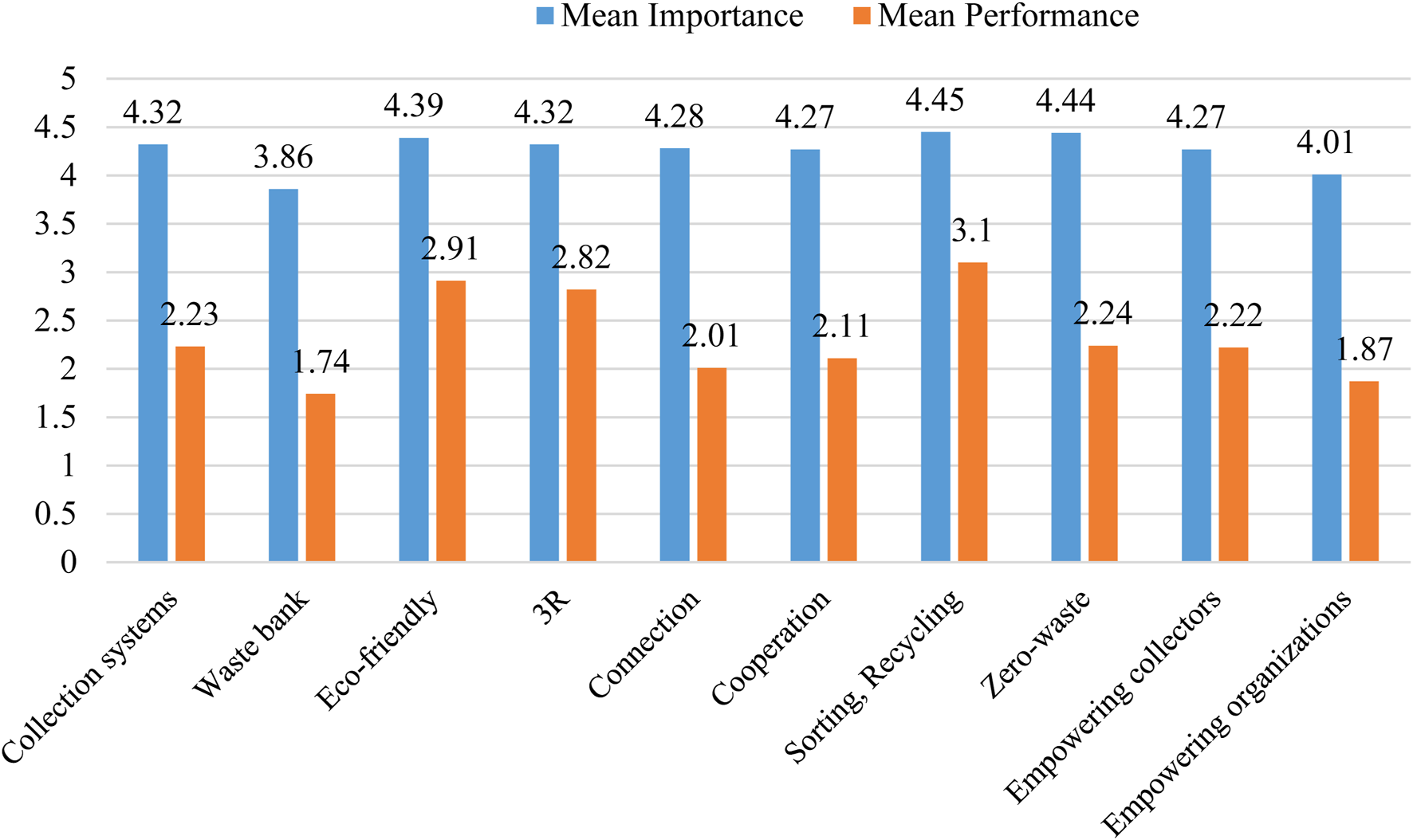 | Developing waste collection systems | 4.27 (4.21; 4.33) | 2.14 (2.08; 2.20) | −2.13 | 0.00 |