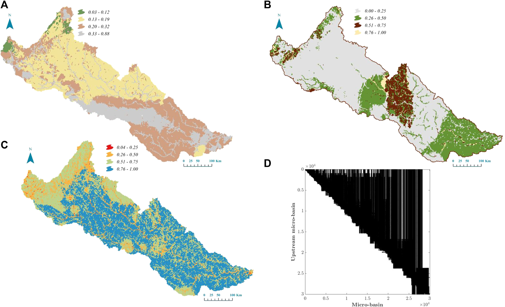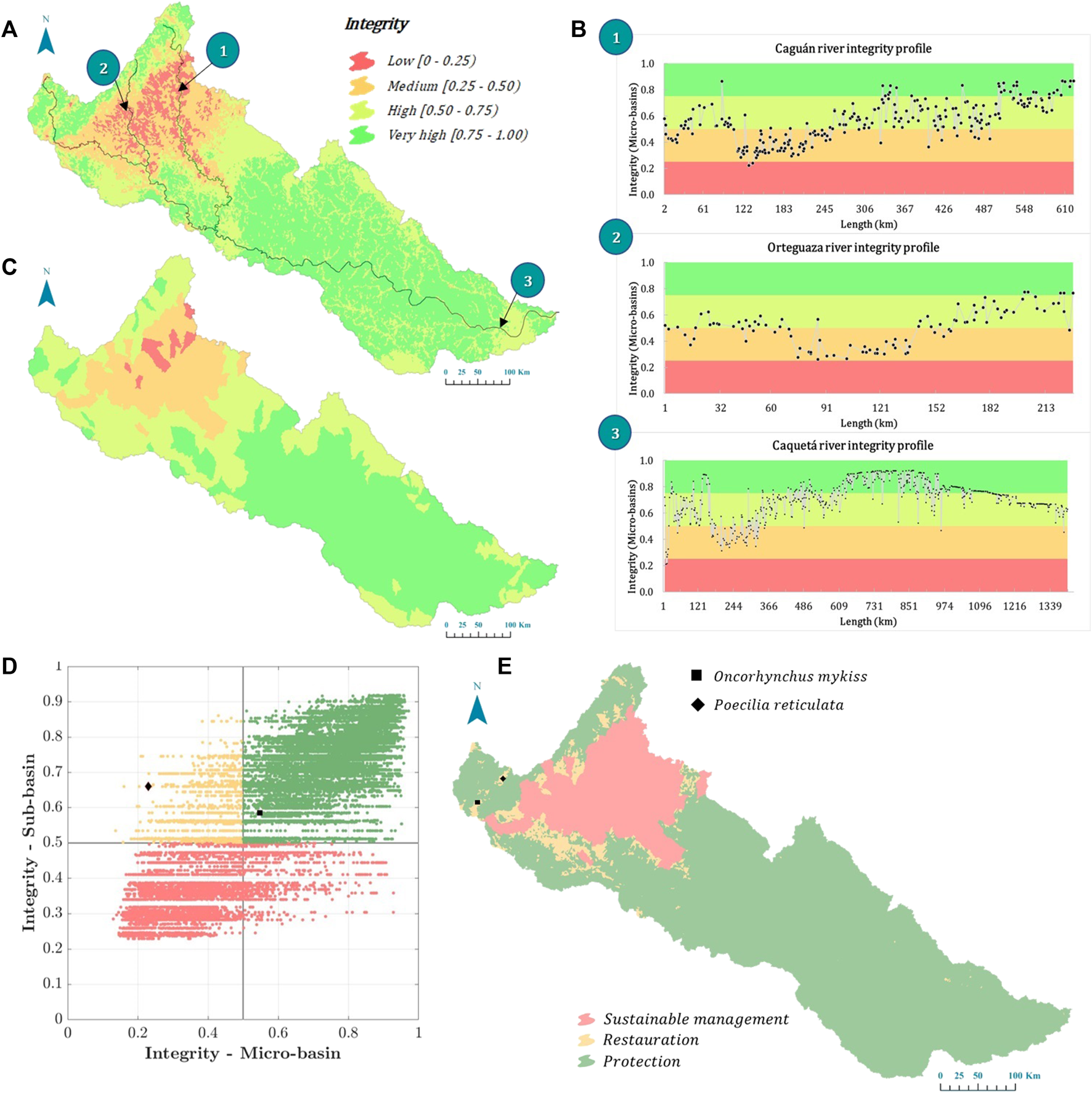 We followed the proposal of Riato et al. (2020) to define conservation opportunities, including protection, restoration, and sustainable management, using the integrity index estimated at the micro-basin and sub-basin levels. The process begins by contrasting the indexes on a 2D scatterplot (both indexes should be scaled between 0 and 1, where 0 represents low integrity and 1 represents high integrity). Then, four quadrants are defined, centered on the 0.5 value of each index. If both the micro-basin and sub-basin indexes show values greater than 0.5, the ecosystem is in good condition; thus, it would be best to consider a protection action because doing so would require minimal intervention. If, instead, the index at the sub-basin scale is greater than 0.5 but the index at the micro-basin scale is less than 0.5, it would be more appropriate to consider restoration as the best conservation opportunity because a healthy sub-basin can support this action. However, if both indexes have values below 0.5, sustainable management would be the best option. In this case, protection and restoration would require considerable effort and resources because they would not be supported by good conditions at either scale.