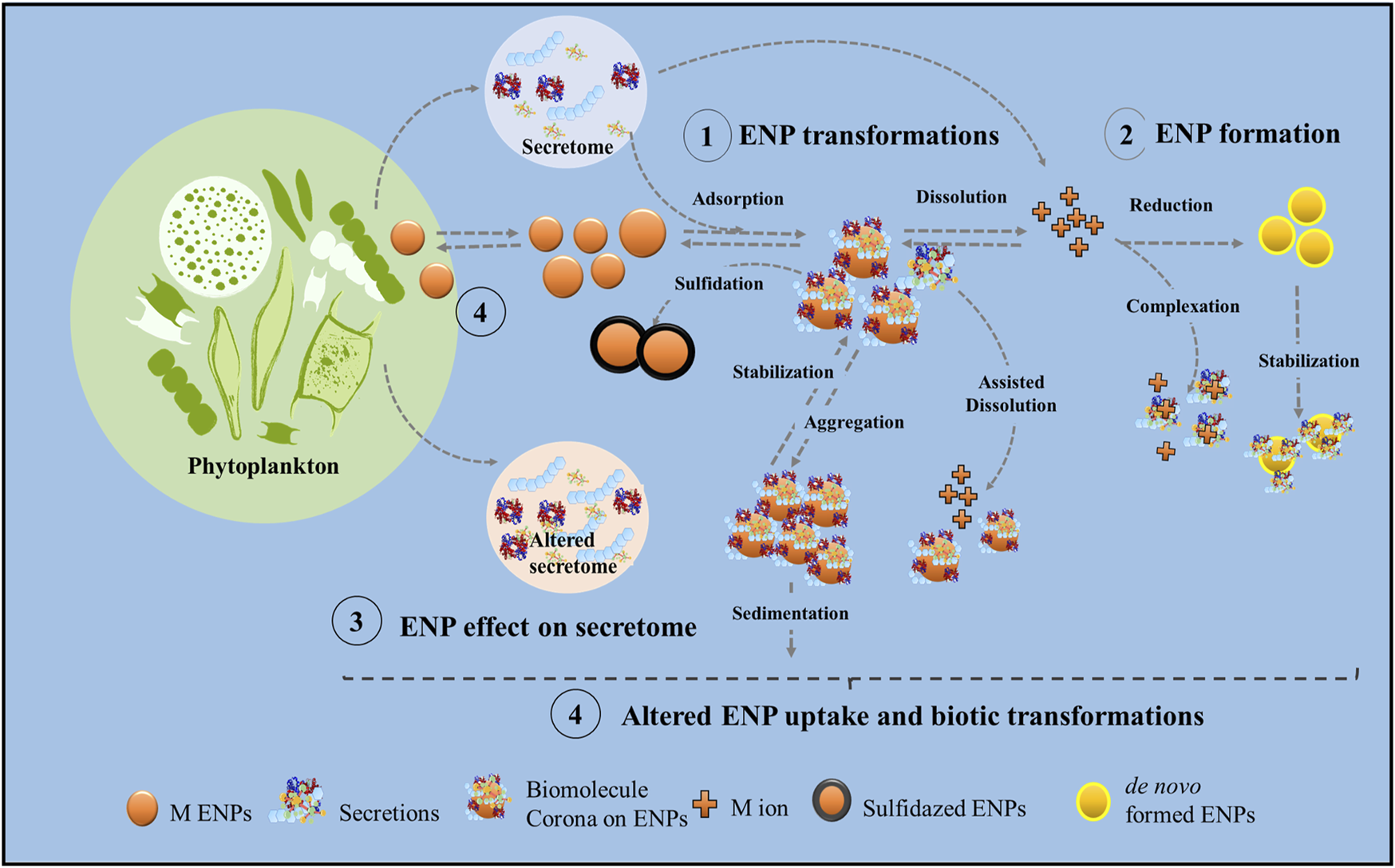 In the present review paper, we focus on the role of the phytoplankton secretions in the fate of the metal-containing ENPs in the freshwater environment. Phytoplankton play a central role in the global biogeochemical cycles of various nutrients (C, O, N, P, and Si) (Falkowski, 1994; Litchman et al., 2015), essential (Sunda, 2012) and toxic (Gregoire and Poulain, 2014; Cossart et al., 2022) trace metals and ENPs (Slaveykova, 2023). For example, the phytoplankton species have been shown to influence the fate of the ENPs by i) secreting various exometabolites and extracellular polymeric substances (EPS); ii) accumulating the ENPs and transforming them via different cellular processes; iii) synthesizing the ENPs inside the cells and/or on cell surfaces from dissolved metal species (Slaveykova, 2023).