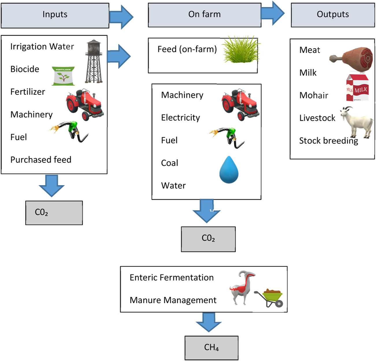 The total GHG emissions were calculated for the whole goat farm, and then, the GHG emissions falling into the product type such as meat, milk, and mohair were distributed based on their share in the total production value. The GHG emissions per product type were divided by the total production amount, and the GHG emissions per production unit were calculated.