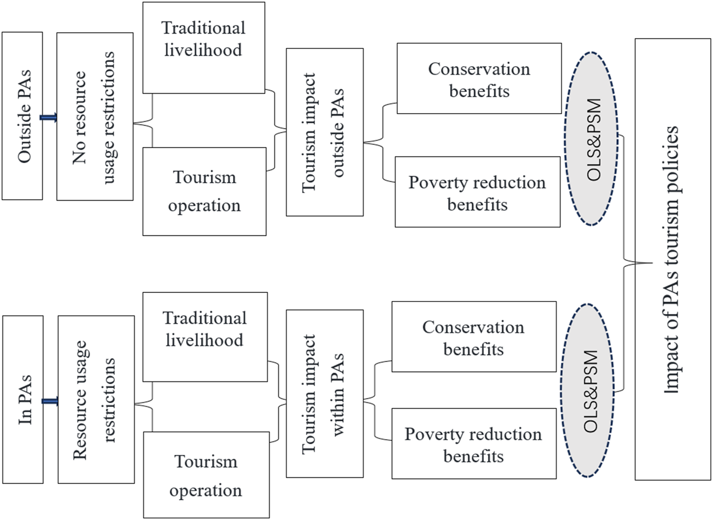 Protected areas have a dual objective of conserving biodiversity and promoting economic development in neighboring communities (IUCN/UNEP/WWF, 1980). The existing management policies of protected areas protect the ecological environment, which to a certain extent contributes to the tourism operations. However, these protection policies also impose significant costs on the surrounding communities. Tourism operations have a dual mission of ecological conservation and alleviating poverty (Guri et al., 2020). Tourism operations can increase household income and alleviate multidimensional poverty. In many cases of protected areas in different countries, the correlation between benefits and a positive attitude towards conservation has been consistently observed. Through this correlation, farmers can be motivated to protect the environment (Hamilton et al., 2000; Salafsky et al., 2001; Ezebilo and Mattsson, 2010), thus achieving the established policy goals of protection and development in protected areas. Therefore, the basis for judging the effectiveness of protected area tourism management policies is to assess the changes in conservation and poverty alleviation effects of tourism operations under these policies. As shown in Figure 2.