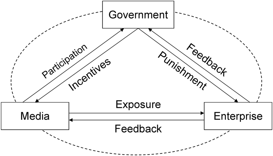 Previous studies have examined corporate carbon emission information disclosure using various analytical approaches, including regression analysis (Karim et al., 2021), game theory (Song et al., 2021), and institutional analysis (Ding et al., 2023). These investigations primarily focus on aspects such as the motives behind corporate carbon emission information disclosure (Li et al., 2019), factors influencing disclosure behavior (Motoshita et al., 2015), and the effectiveness of governance measures (He et al., 2023), among others. Some studies adopt a stakeholder perspective, examining multiple actors involved in corporate carbon emission information disclosure, including the government, enterprises, media, and the public (Zhang and Liu, 2020). Many studies highlight the crucial role of government regulations in constraining corporate disclosure behavior, such as the design of incentive-compatible systems and the improvement of laws and regulations (Liu and Li, 2019; Yan et al., 2020). Additionally, some studies emphasize the significance of media oversight, which is believed to enhance transparency, objectivity, public trust, and support for corporate emission reduction actions (Luo et al., 2019; Shao and He, 2022). However, the current research lacks an investigation into the governance of corporate carbon emission information falsification from a government regulation and media monitoring standpoint. The deceptive practice of falsifying corporate carbon emission information is not uncommon. Considering this practical challenge, it is imperative to delve into how governmental and media decision-making behaviors influence enterprise carbon emission information practices. Moreover, it is crucial to optimize the system to effectively address issues related to carbon emission information falsification, ultimately contributing to the establishment of a high-quality carbon market in China.