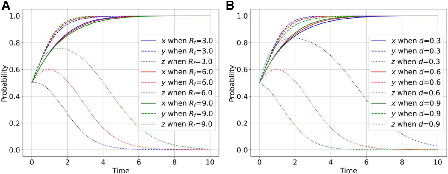Based on the principles of Lyapunov theory (Friedman, 1991), a Jacobian matrix is deemed asymptotically stable if all its eigenvalues (λ) are less than zero. Conversely, it is classified as unstable when all eigenvalues are greater than zero. Additionally, when the Jacobian matrix exhibits both positive and negative eigenvalues (λ), signifying a saddle point, the equilibrium point is considered unstable. By taking partial derivatives of F(x), F(y), and F(z) with respect to x, y, and z, respectively, the Jacobian matrix can be obtained, as expressed in Eq. 5.