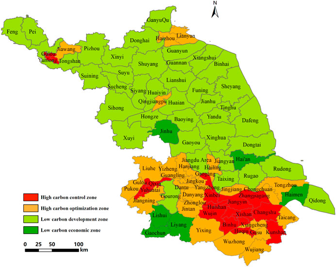 By integrating indicators such as carbon emissions, carbon sequestration, and economic contributive coefficient and ecological support coefficient (Zhao et al., 2014), Jiangsu Province’s county-level regions were categorized into four zones: high carbon control zone, high carbon optimization zone, low carbon development zone, and low carbon economic zone (Table 1; Figure 7).