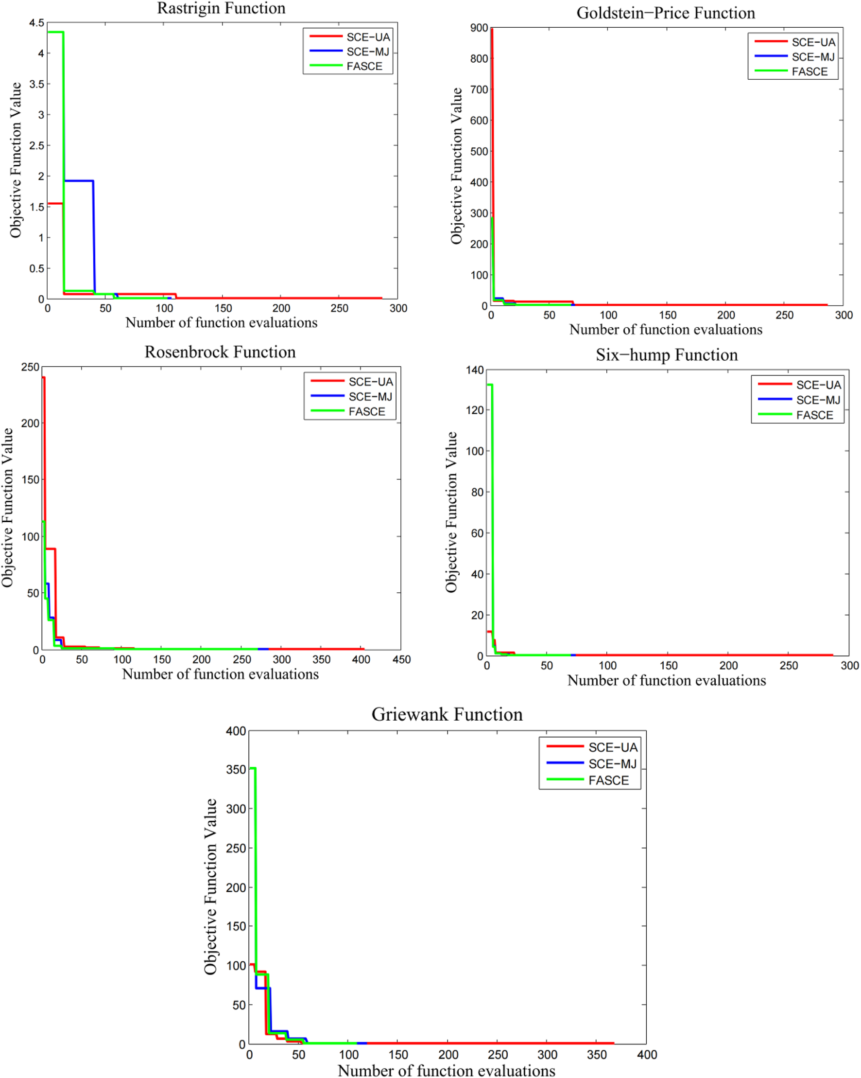 | Problems | Number of complexes | Population size | SCE-UA | SCE-MJ | FASCE | ||||