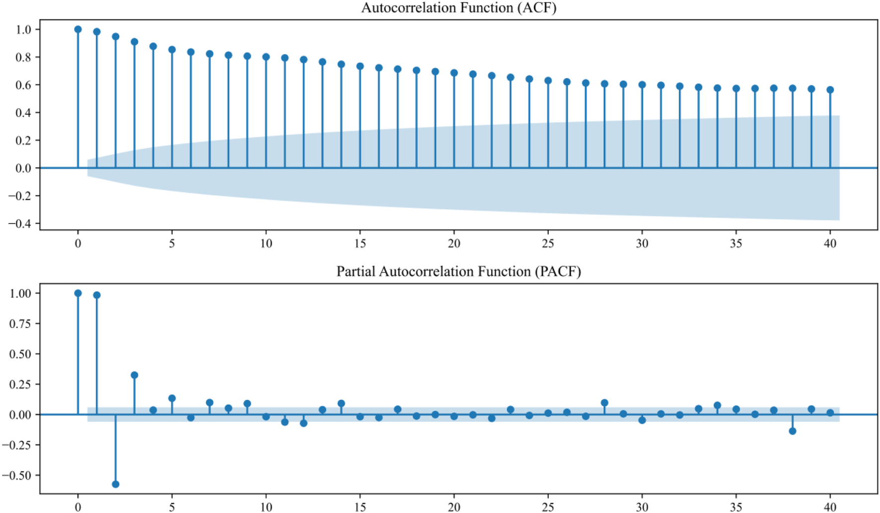 1) The ACF exhibited a correlation coefficient higher than 0.8 at lag 5.