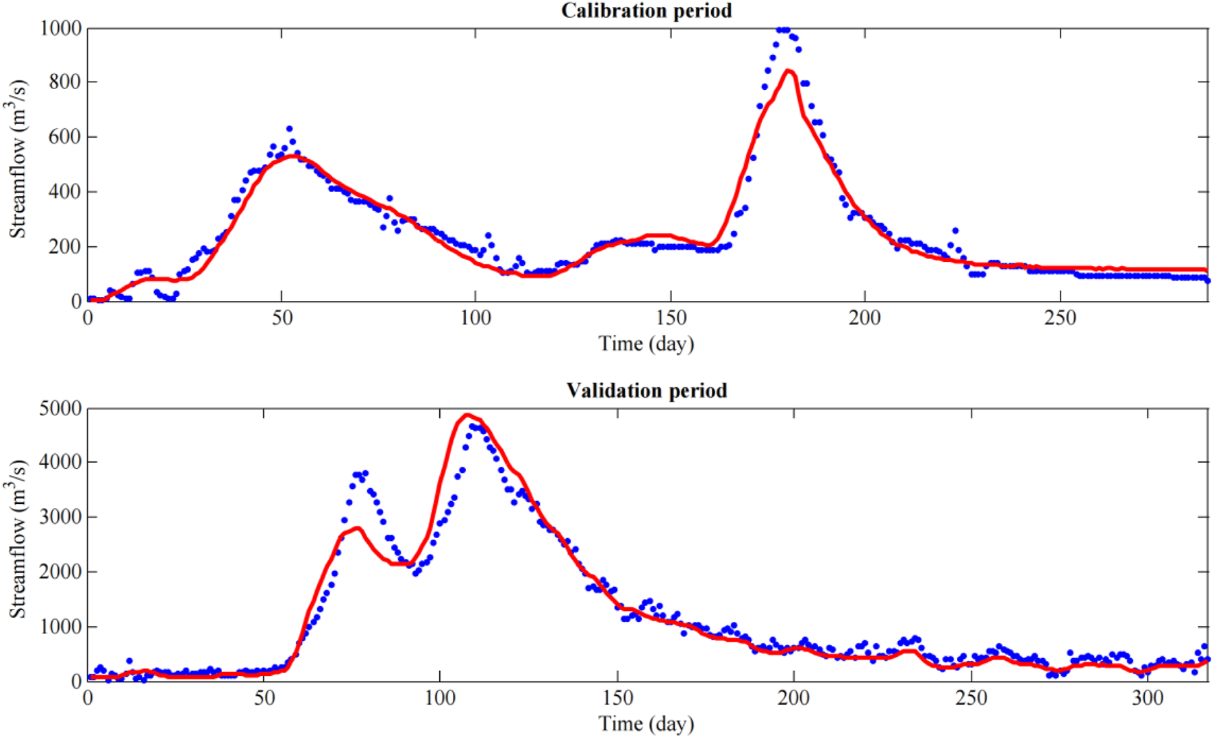 In this paper, we conducted a study on the Changjiang (Yangtze) River basin. To calibrate and validate our model, we used the observed streamflow data from Yichang Station between 1 January 2005, and 31 December 2007. The data is divided into two sets: the first 730 streamflow data points were used for model calibration, and the remaining data points were used for model validation.