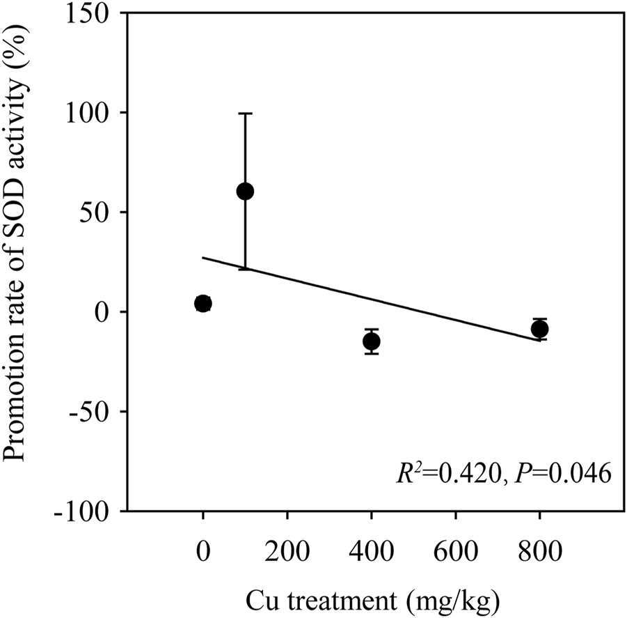 Regression of the promotion rates of superoxide dismutase (SOD) activity and Cu treatments. Error bars indicate the standard deviation of four independent replicates.