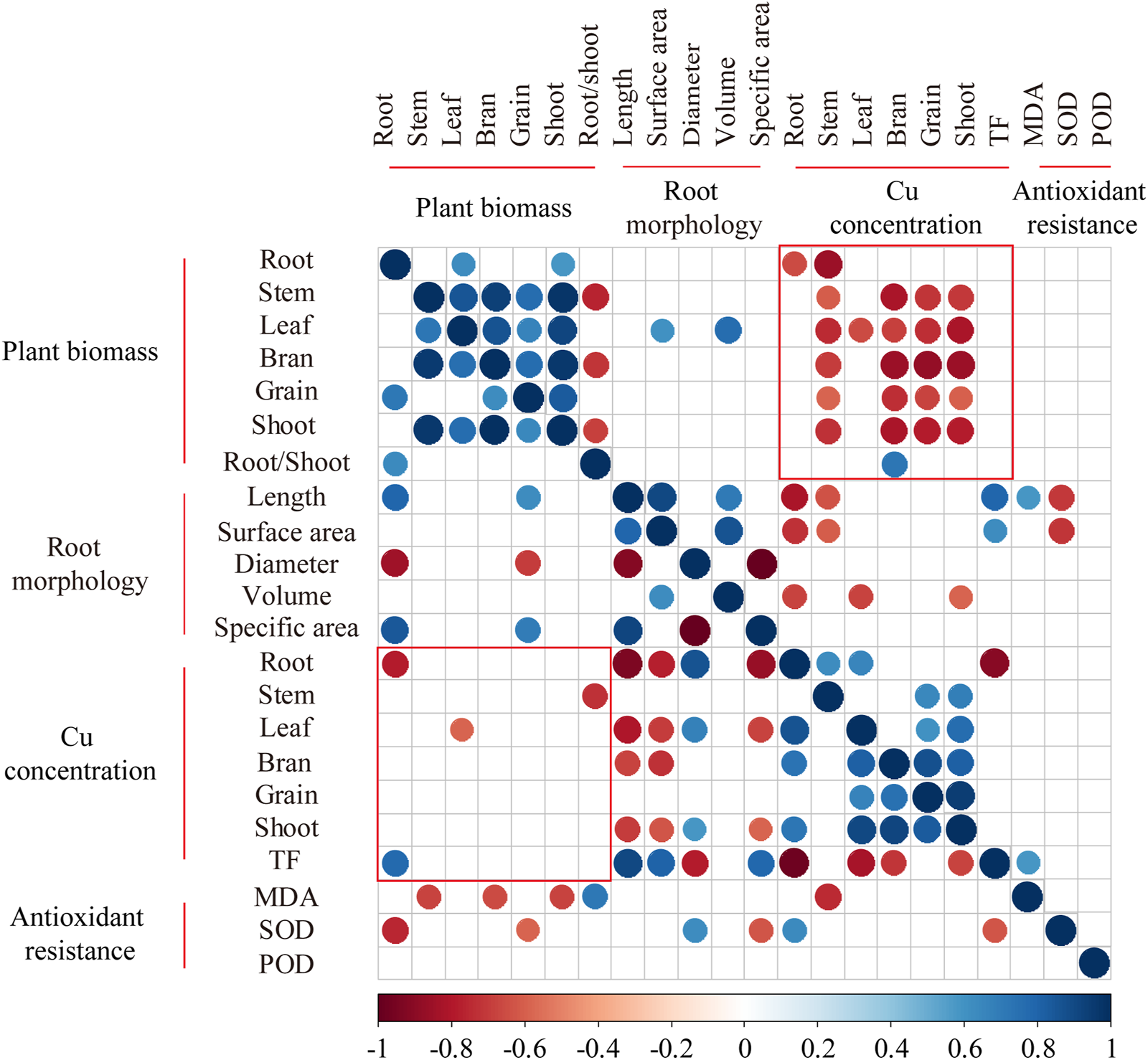 Spearman’s correlations between plant biomass, root morphology, Cu concentration, and antioxidant resistance (n = 24). Only statistically-significant relationships (p < 0.05) are shown, and the colored (red/blue) plots represent significant correlation. The lower part was extracted from nonnighttime warming treatment, and the upper part was extracted from nighttime warming treatment. TF: Translocation factor; MDA: malondialdehyde; SOD: Superoxide dismutase; POD: Peroxidase.