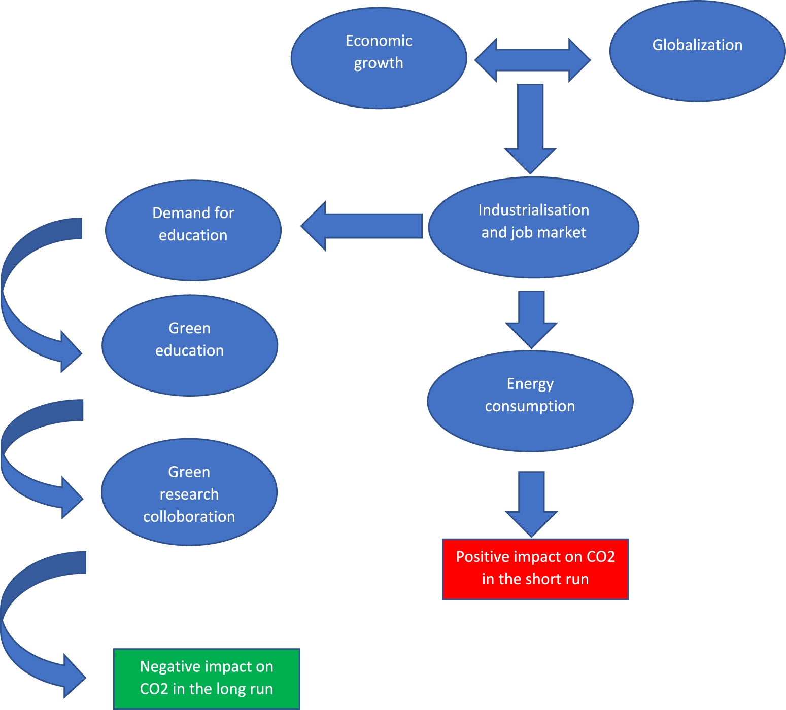 The conceptual framework delves into the intricate relationship between higher education as mentionned in Figure 2 and CO2 emissions. Economic growth and a country’s openness intertwine, driving industrialization and job creation. This results in a temporary surge in energy consumption and subsequent CO2 emissions.