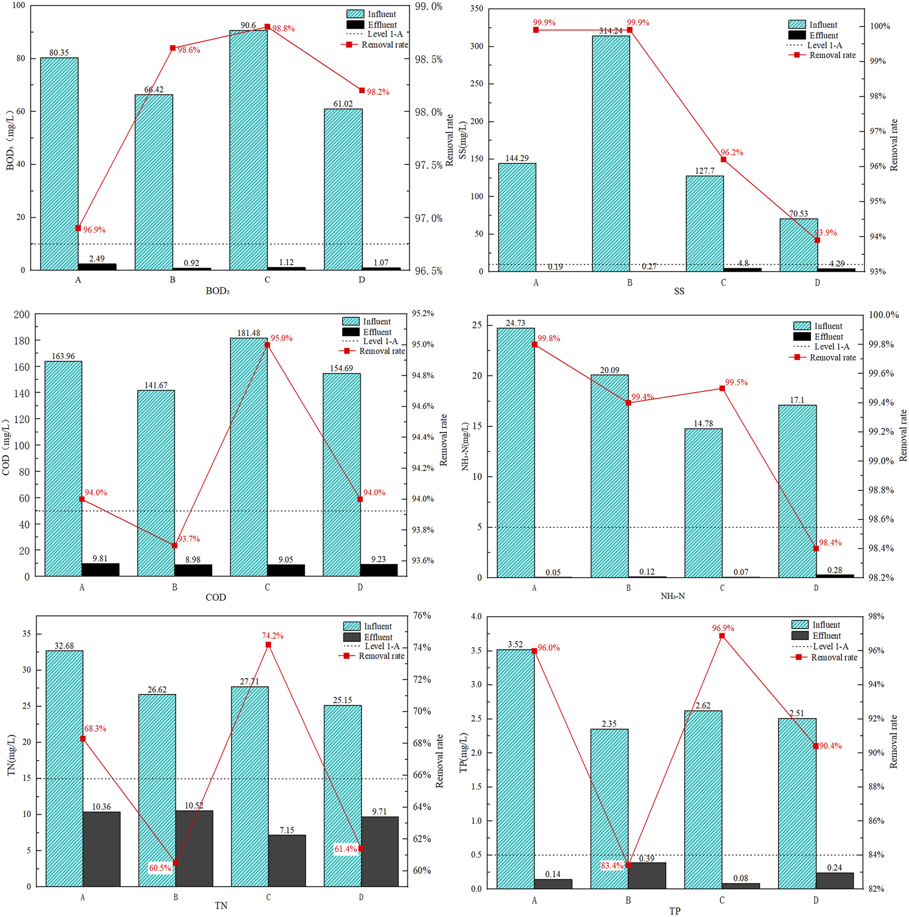 In terms of the overall pollutant removal rates, nationwide urban WWTPs in China achieve BOD5, SS, COD, NH3-N, TN, and TP removal rates of 94.2%, 95.1%, 90.6%, 97.3%, 70.7%, and 92.3%, respectively (Hu, 2021). Comparatively, the selected WWTPs demonstrate higher BOD5, SS, and COD removal rates than the national average. However, the TN removal rates for Plants A, B, and D are 2.4%, 10.2%, and 9% lower than the national average, respectively. Similarly, the TP removal rates for Plants B and D are 8.9% and 1.9% lower than the national average, respectively. Despite these slightly lower TN and TP removal rates, the overall removal efficiency for other pollutants remains quite good.