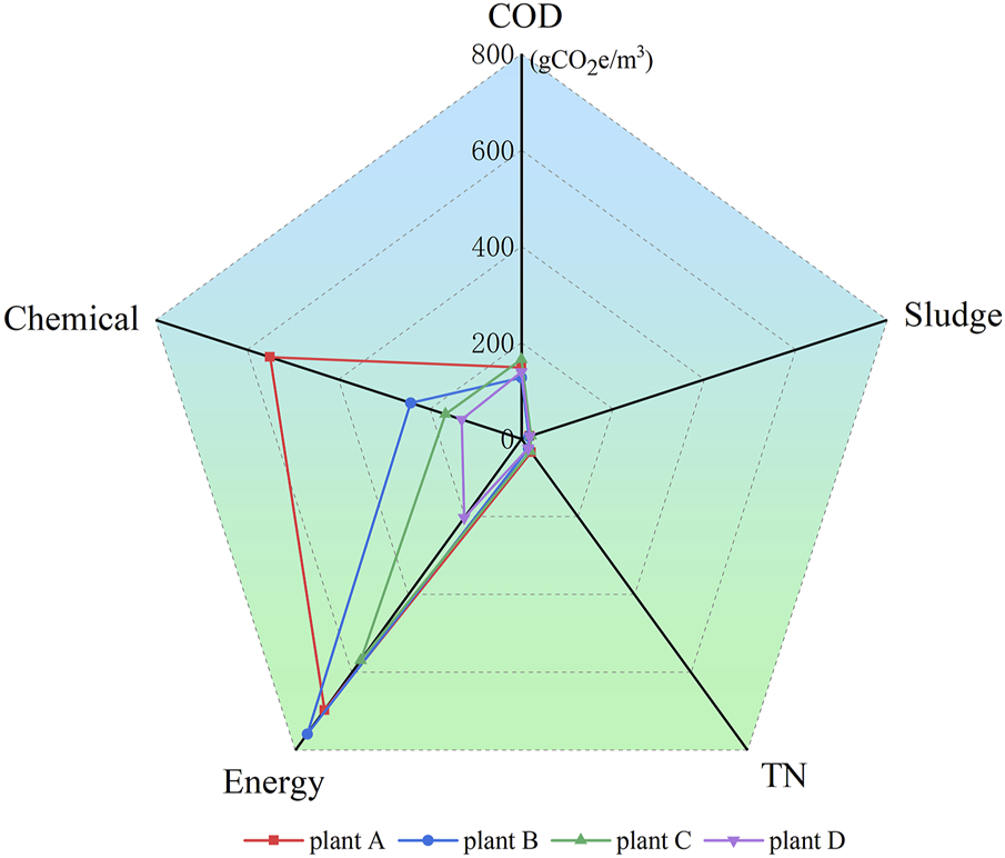 The carbon emissions from WWTPs can be divided into two main components. The first component refers to direct emissions during the biochemical treatment process, which primarily include the release of greenhouse gases such as CH4 generated during the removal of COD, methane produced during sludge treatment, and N2O resulting from the removal of TN (Lv et al., 2022).