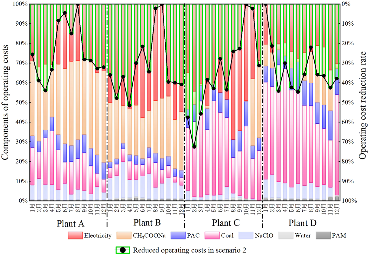 In terms of chemical consumption, Table 3 presents the average daily tap water consumption ranging from 22.21 to 123.50 m3, with unit wastewater consumption ranging from 1,910.57 to 2,901.64 g/m3. The order of unit wastewater consumption from the highest to lowest is as follows: Plant B > Plant C > Plant A > Plant D. Similarly, the average daily dosage of chemicals, such as CH3COONa, PAC, PAM, and NaClO, is provided. Regarding CH3COONa consumption, to compare it uniformly in terms of COD equivalent, the median value of CH3COONa dosing for WWTPs nationwide in China is 16.9 gCOD/m3, with approximately 95% of WWTPs consuming less than 115 gCOD/m3 of carbon sources per unit of wastewater and 50% consuming less than 18.9 gCOD/m3 (Hu et al., 2021). Given the conversion rate of 1 g CH3COONa to COD equivalent (approximately 0.78 g COD/g CH3COONa), the unit wastewater dosages for Plants A, B, C, and D are 261.38, 115.91, 46.74, and 29.20 gCOD/m3, respectively. These values exceed half of the carbon source consumption values of WWTPs nationwide. Additionally, the nationwide median value for PAC dosing is 6.7 g/m3, with unit wastewater consumption primarily falling within the range of 1–22 g/m3 (which accounts for approximately 90% of the total). Although Plant B has the lowest consumption among Plants A, B, C, and D (30.32 g/m3), it still exceeds 90% of the national consumption in WWTPs.