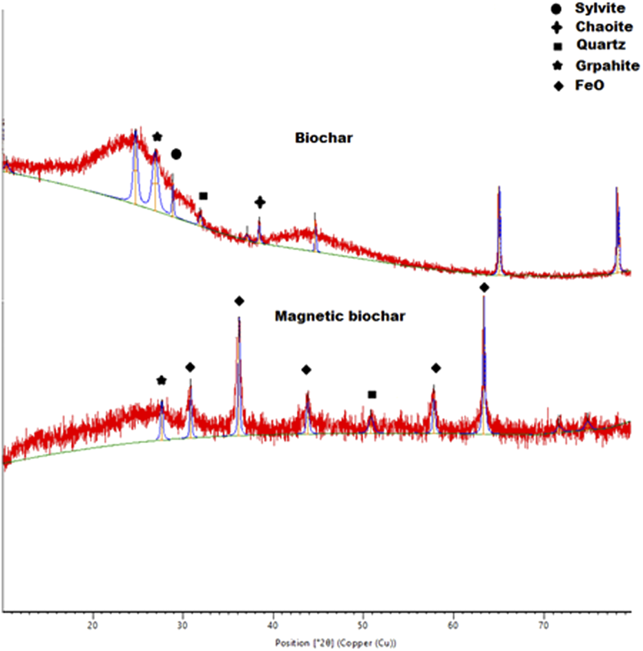XRD spectra of biochar and magnetic biochar.