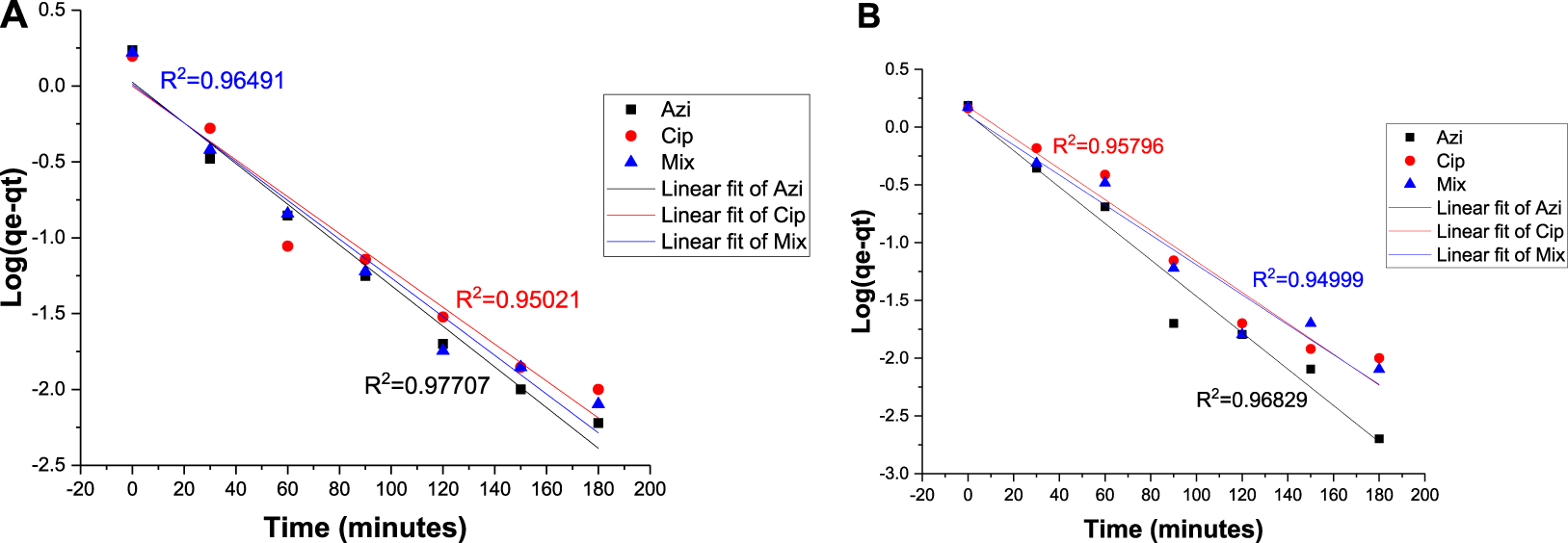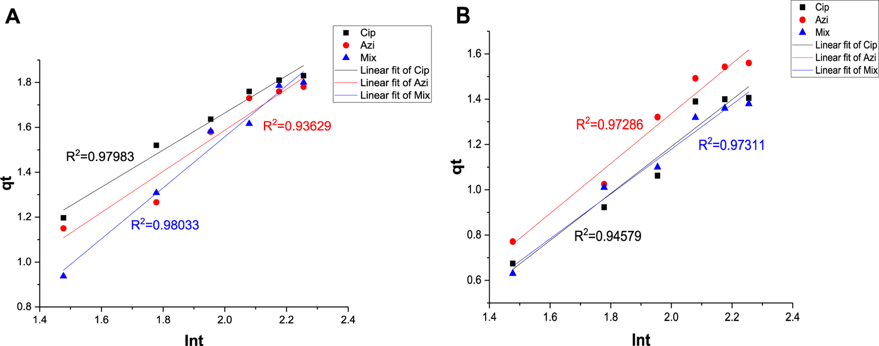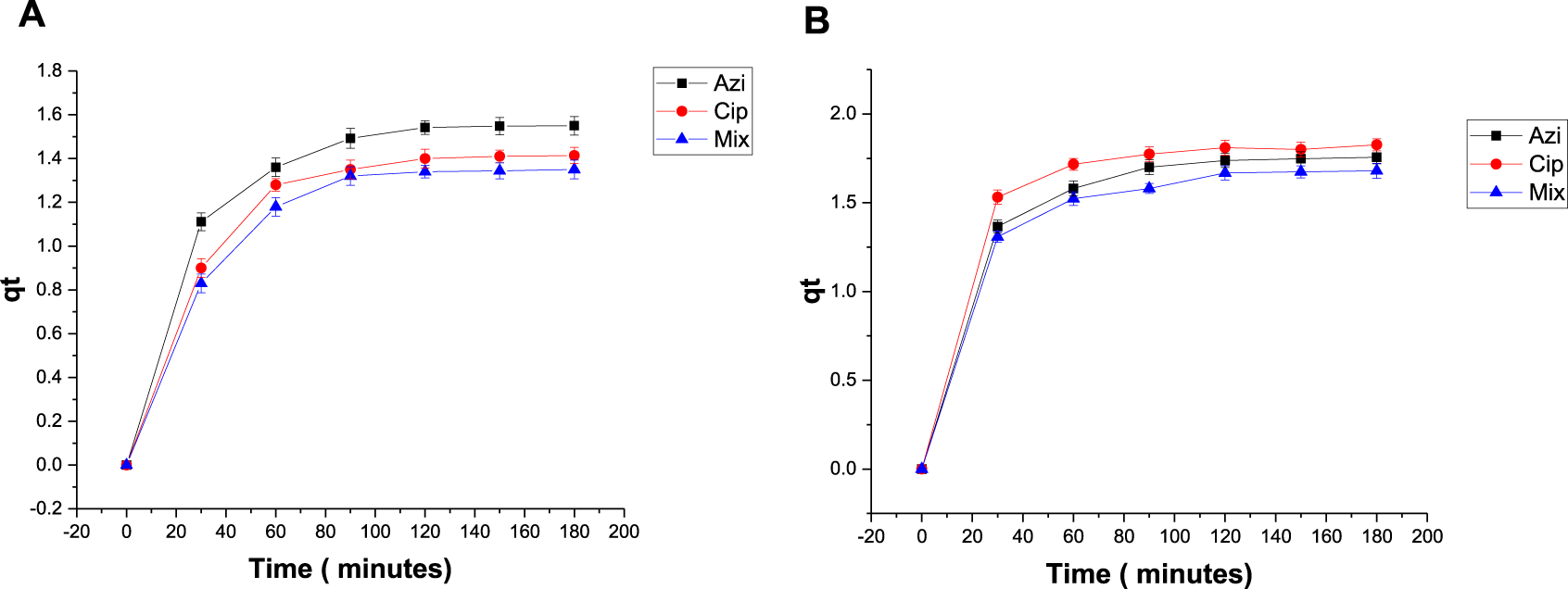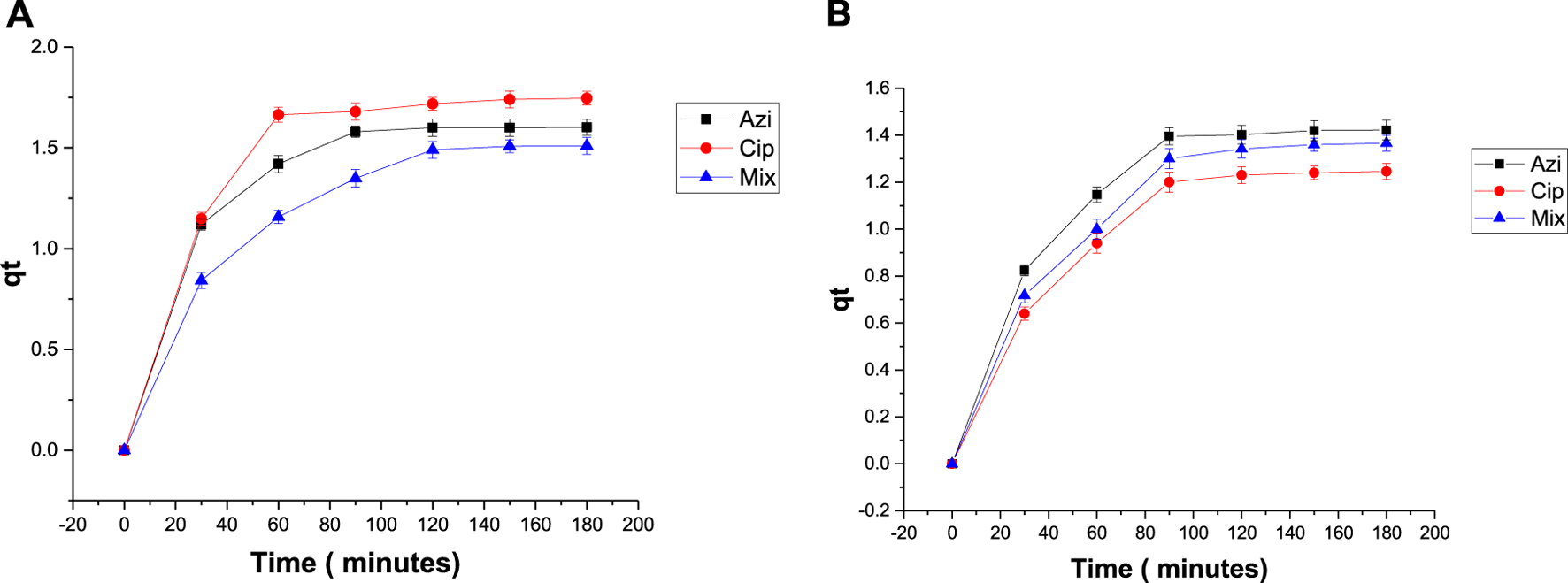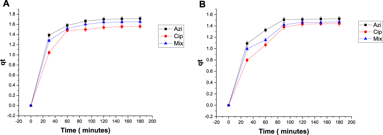 Plot of qt versus t with antibiotics: (A) 0.1 g Fe-modified biochar and (B) 0.2 g Fe-modified biochar.