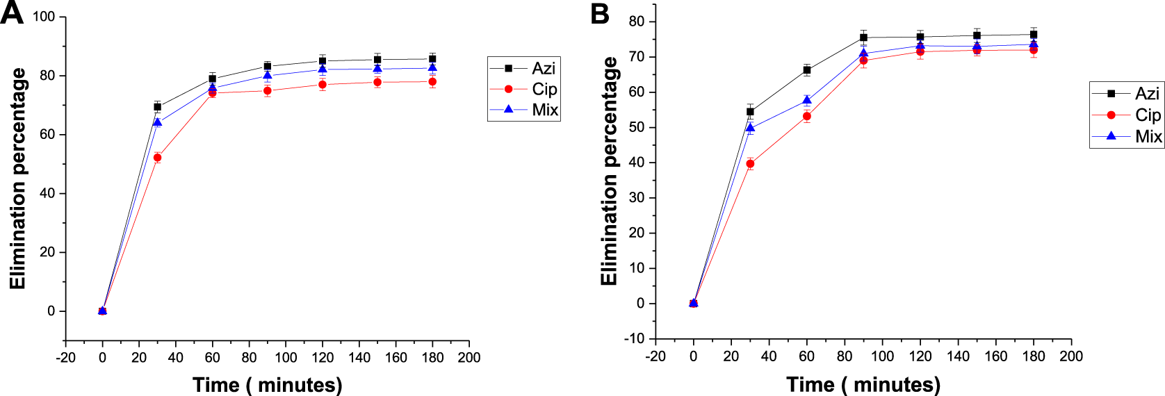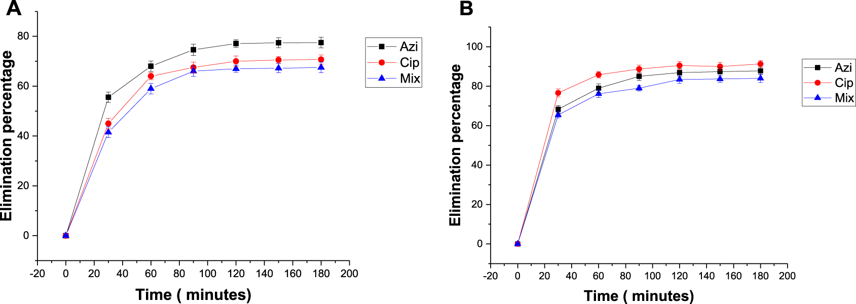Effect of temperature on the elimination percentage of antibiotics: (A) 25°C and (B) 40°C.