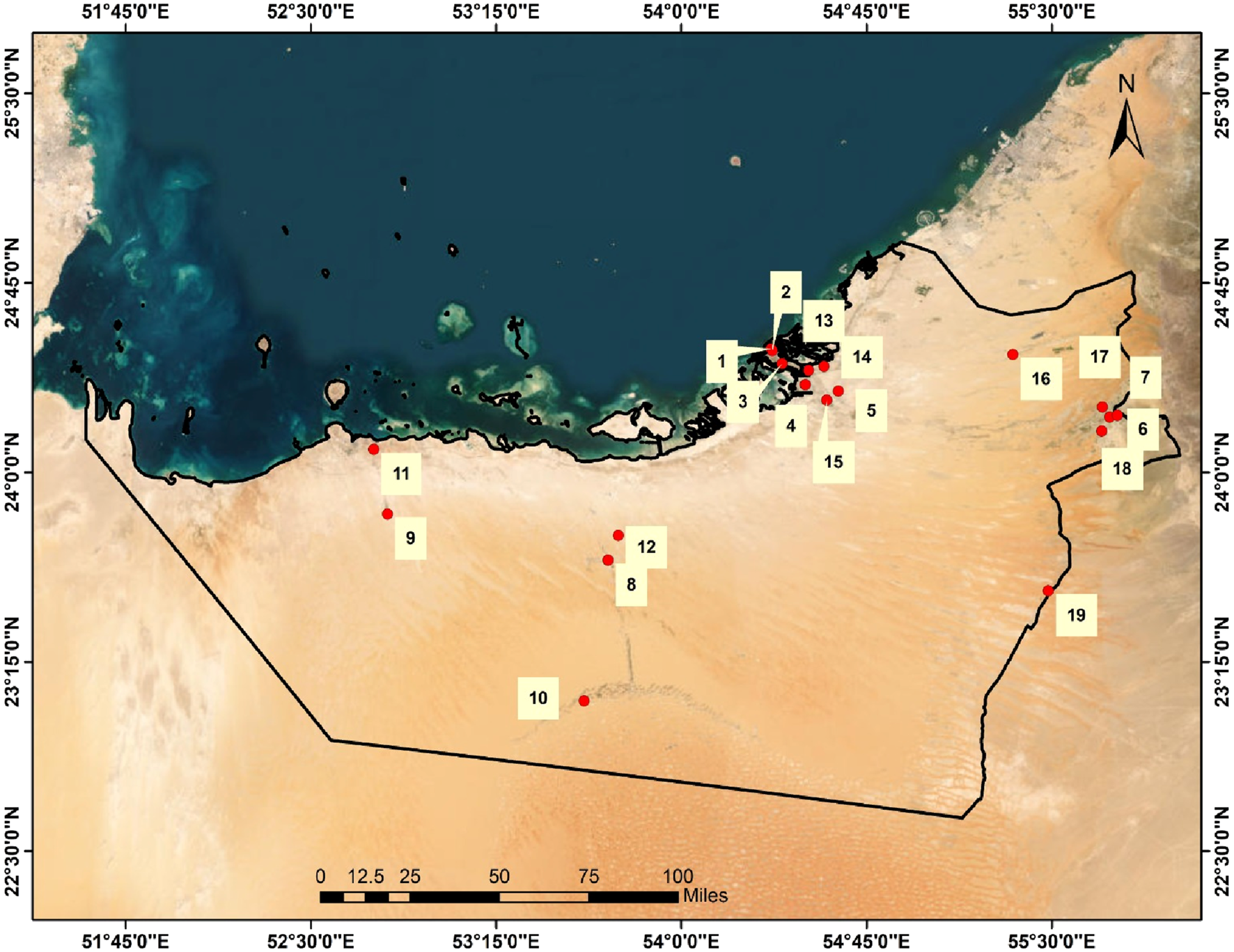 Locations Map of Air Quality ground-based monitoring stations in Abu Dhabi, UAE.
