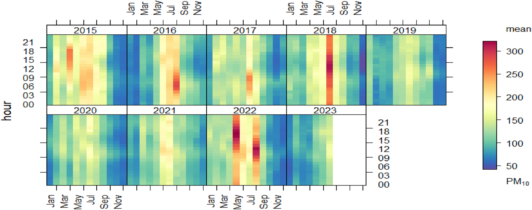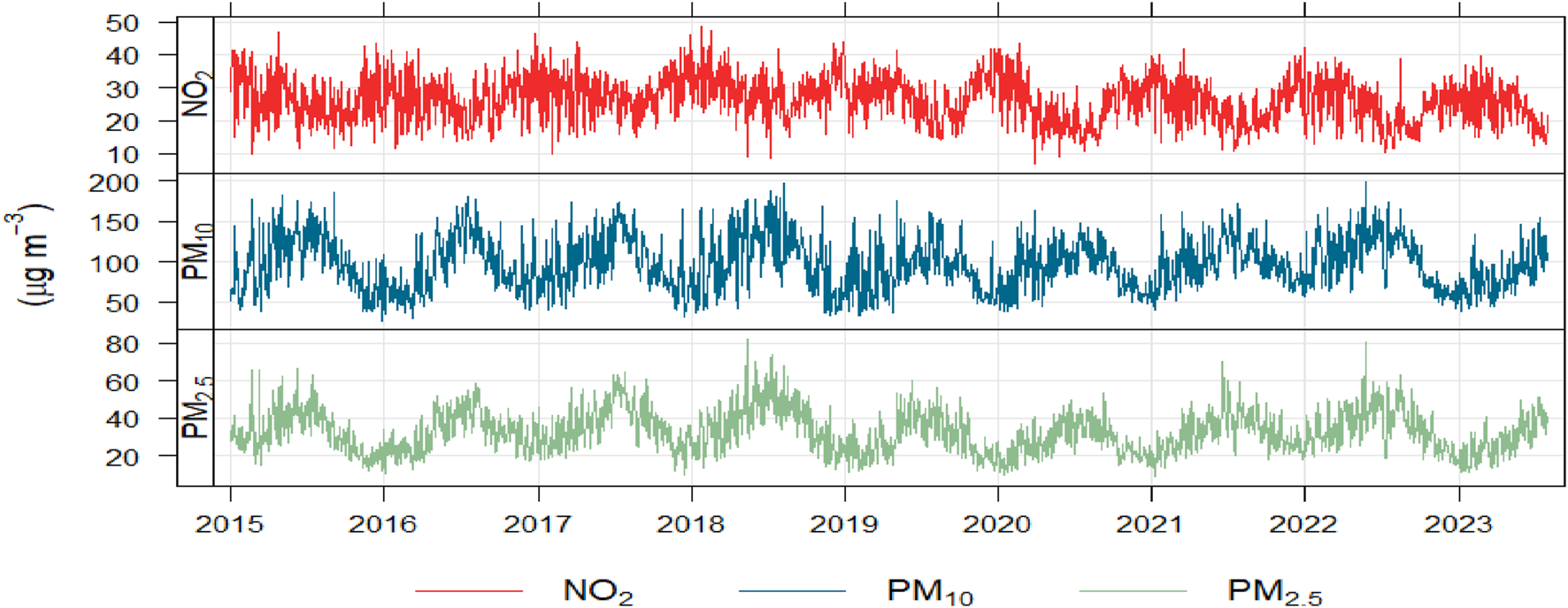 Figures 4–6 display the changes in daily, monthly, and yearly averages for NO2, PM10, and PM2.5 spanning from 2015 to 2023, after correcting for missing data and outliers at all monitoring locations. The daily averages for NO2 generally fluctuated between 20 and 35 μg/m³, with a distinct decrease in the daily and monthly averages of NO2 noted after the year 2020. Similarly, the emissions historical evolution for PM10 and PM2.5 showed a steady rise starting in January, reaching their highest levels in July, and then beginning to fall. The year 2022 stood out for having significantly higher concentrations of PM10 and PM2.5. Additionally, 2018 was highlighted as the year with the peak emissions for all three pollutants.