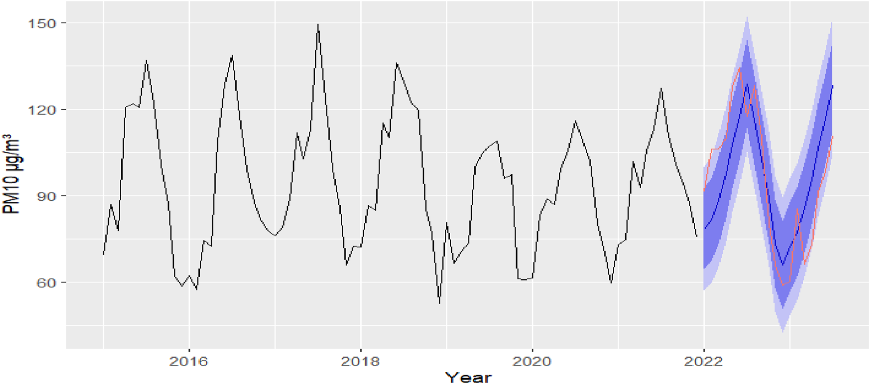 Seasonal ARIMA models were developed to analyze the monthly data for PM10, PM2.5, and NO2. The models’ accuracy was tested by comparing their forecasts against actual data from a held-out test period spanning 2022-2023. The Autoregressive Integrated Moving Average (ARIMA) modeling process involved applying the Auto ARIMA function to both daily and monthly datasets covering the years 2015–2021. The ARIMA framework combines autoregressive (ARI) elements with moving average (MA) components, offering a robust method for examining time series data that exhibits consistent patterns.