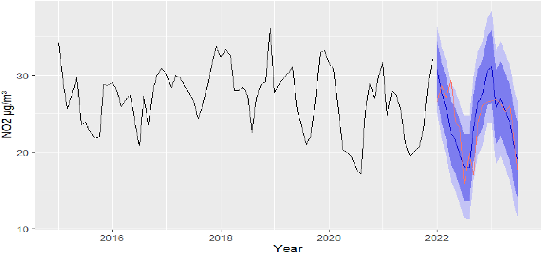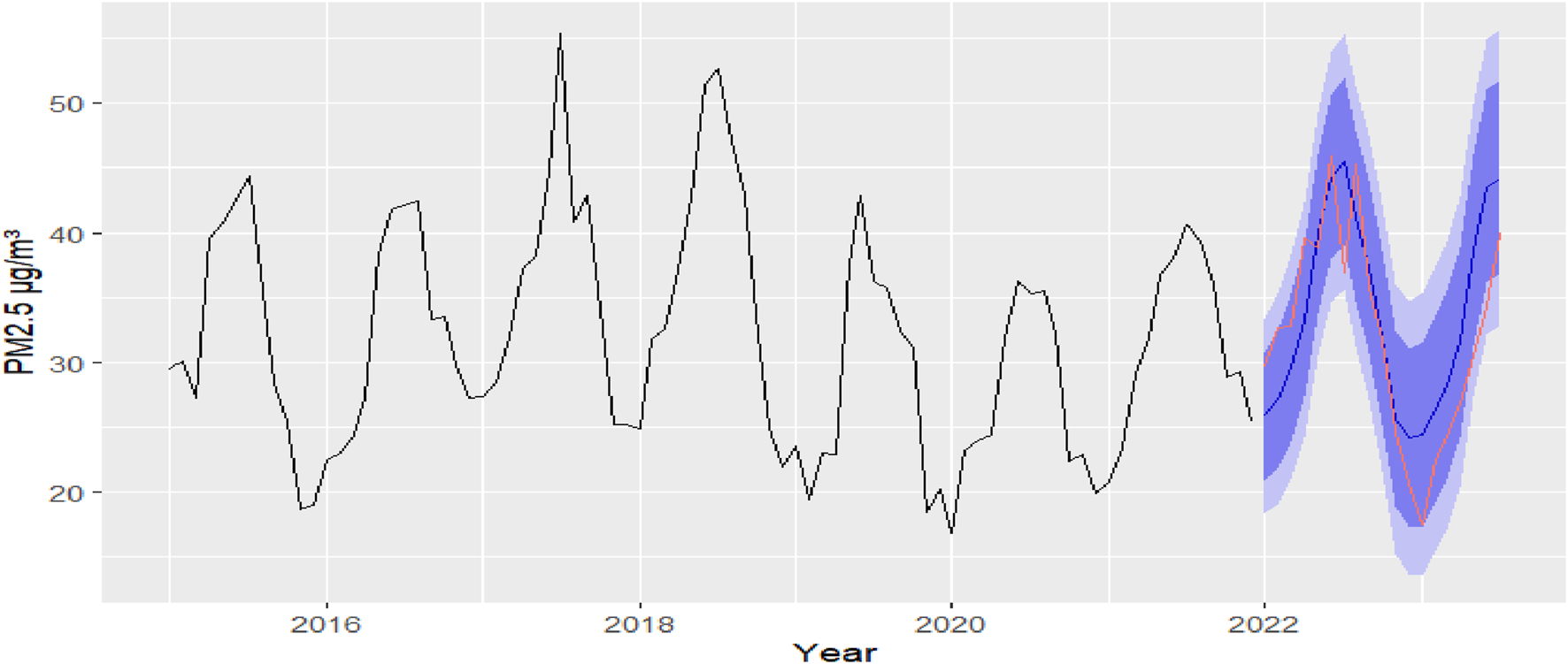 Subsequently, the optimal model was utilized to project air quality values from 2022 to July 2023. The model’s precision was quantified using the Mean Absolute Percentage Error (MAPE). It is critical to evaluate the performance of forecasting models to verify their predictive accuracy and to facilitate comparisons among various forecasting techniques. Enhancing the accuracy of predictions is usually the main goal in forecasting tasks. Due to the limitations of the Akaike Information Criterion (AIC) in comparing models from different families (for example, ARIMA versus Holt-Winters) (Ilyas et al., 2024), other criteria are adopted for the assessment and comparison of models. This research chose to use the Mean Absolute Percentage Error (MAPE) as one of these criteria because of its broad recognition and ease of use in time-series forecasting, especially in the context of predicting levels of NO2, PM10, and PM2.5 (Garg et al., 2021; Rahman et al., 2023).