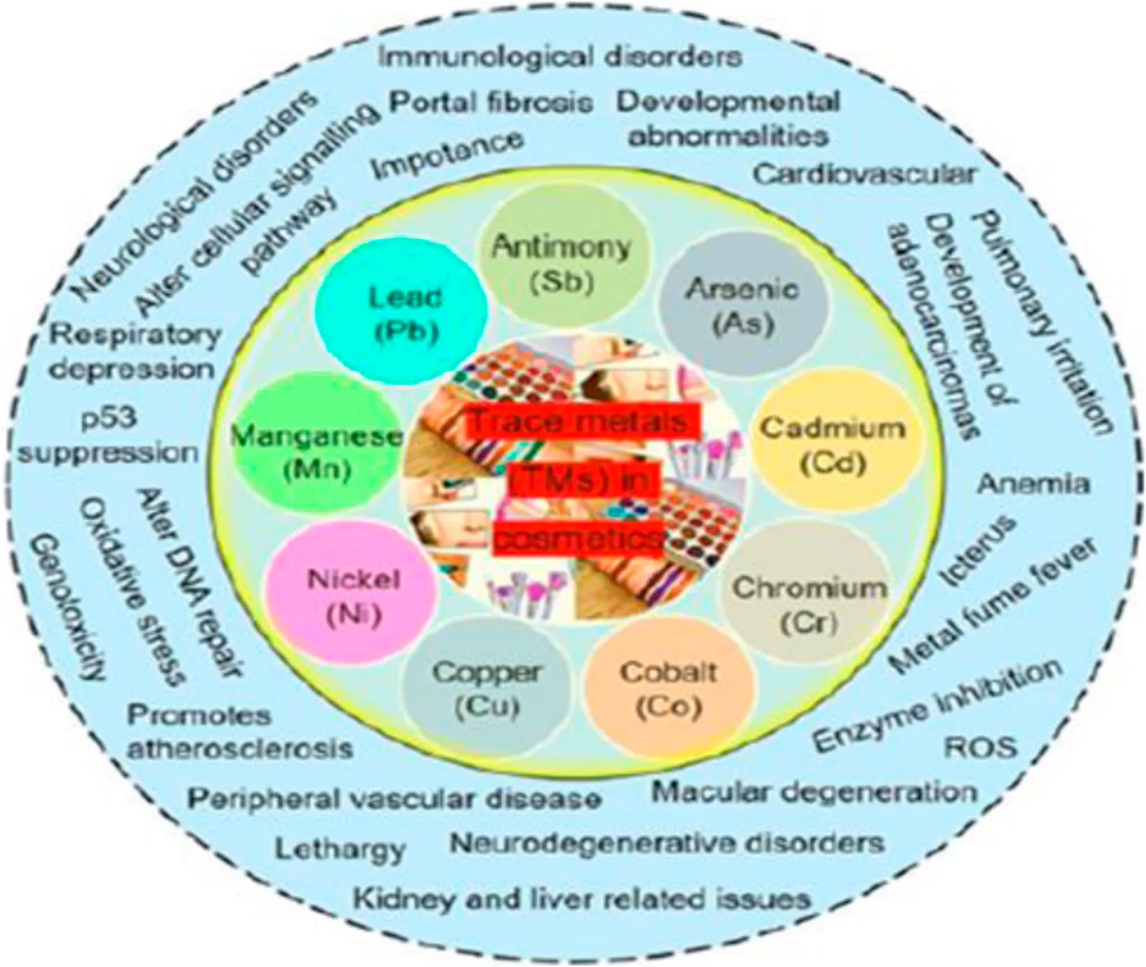 Cadmium: Cadmium exposure from cosmetics has been associated with lung damage, kidney dysfunction, and bone disorders. Long-term exposure to cadmium may increase the risk of cancer and disrupt hormonal balance in the body (Ramelli et al., 2012; Genchi et al., 2020; Charkiewicz et al., 2023).