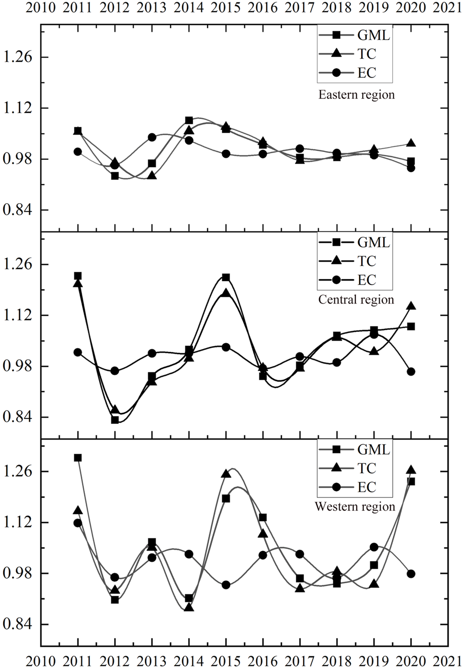 By combining the above with the technical efficiency parameter, ρ, the GML index can be constructed as shown in Equation 3:where represent the global efficiency values of period t and period t+1 respectively, and G represents the agricultural GTFP index. By taking 2010 as the base period, we can obtain the agricultural GTFP of each province by cumulative accumulation of the calculation results of subsequent years.