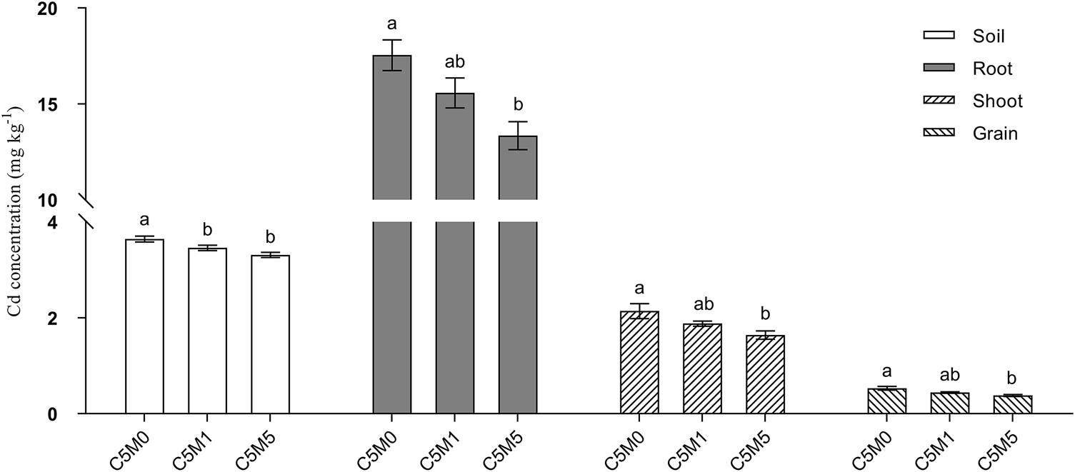 Content of Cd in the grain, roots, shoots, and soil. Mean values ±S.D. are shown (n = 3). Significant differences are shown by various letters above each column (p < 0.05).