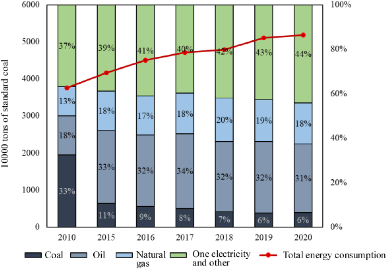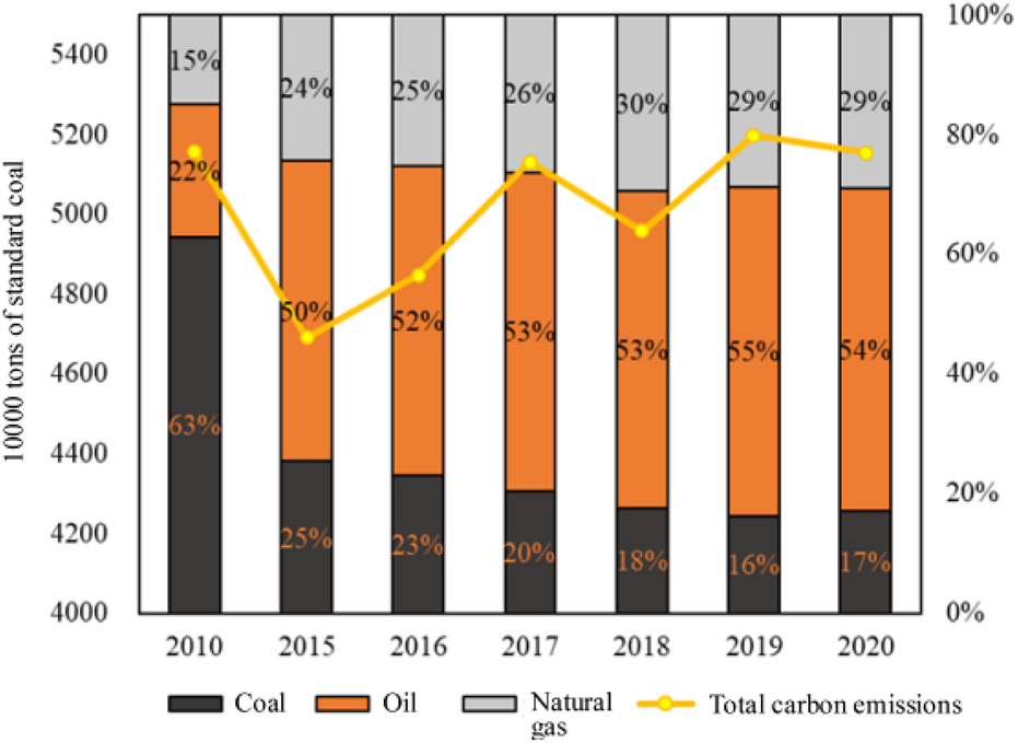 Changes in total energy consumption and energy structure in Chengdu from 2010 to 2020.