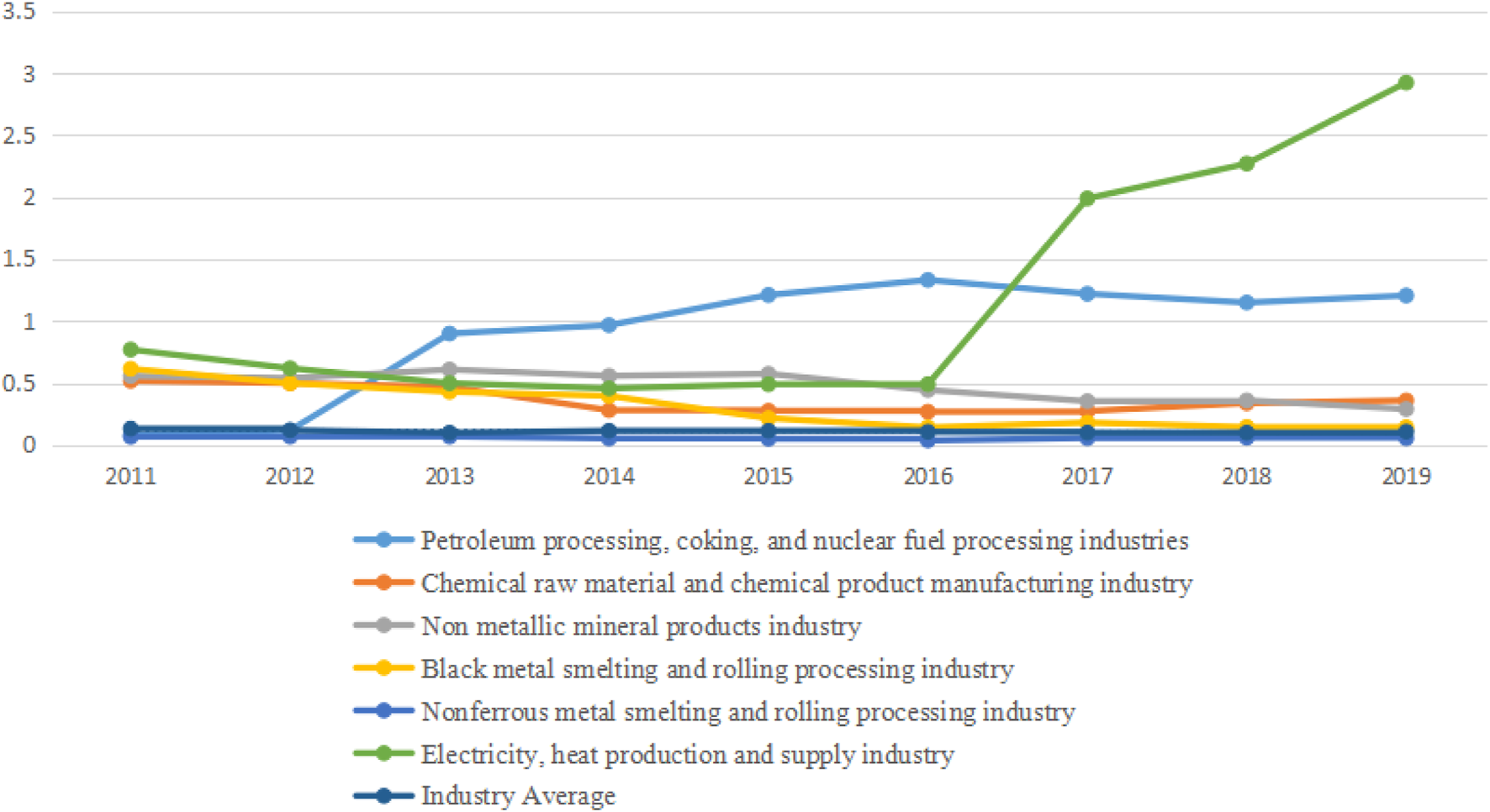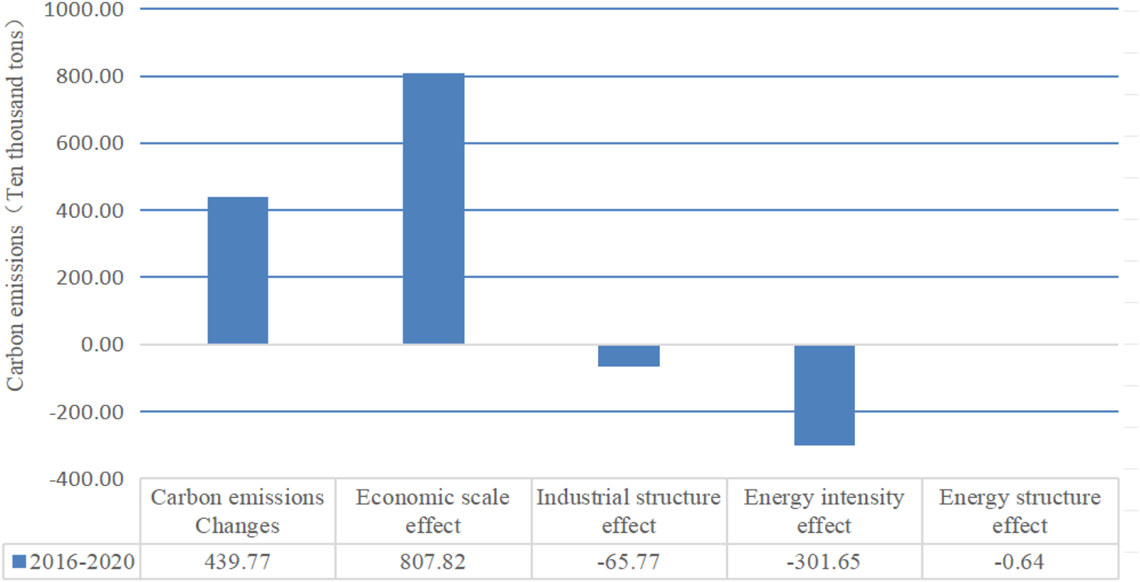 This study analyzes the role of the energy structure in different industries in Chengdu’s carbon emissions growth during the 13th Five-Year Plan period (2016–2020). The results are shown in Figure 5.
