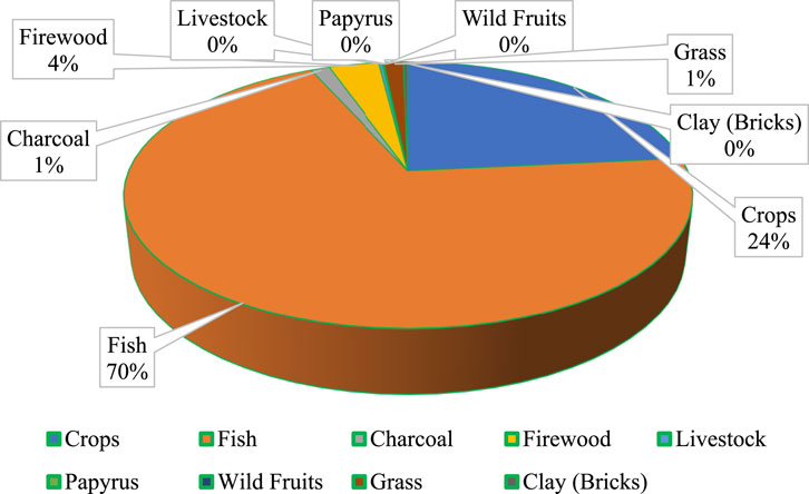 The major products collected from the Bangweulu Wetland and surrounding areas include fresh water (21.3%), crops (19.1%), fish (15.4%), woodfuel (11.6%), grass (10.6%), livestock (9.0%), wild resources (4.0%), reeds (3.5%), papyrus (3.3%) and clay (2.2%) (Figure 2).