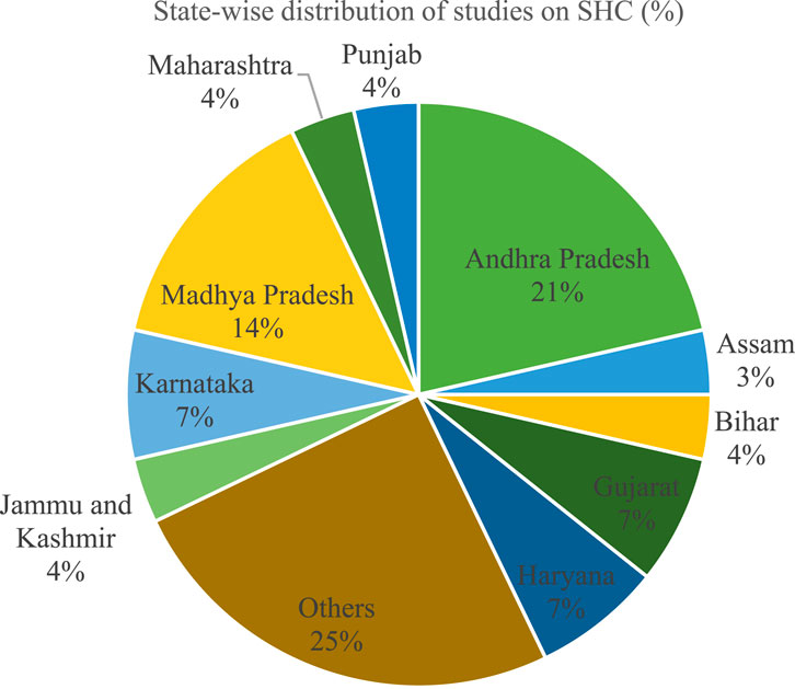 Figure 7; Tables 2, 3 highlight the thematic patterns and key findings emerging from the SHC-related studies. The findings reveal a disproportionate concentration of studies in Andhra Pradesh (21%), and Madhya Pradesh (14%), while several regions—such as Odisha, Himachal Pradesh, and the broader Northeastern belt—remain significantly underrepresented (Figure 7). This suggests a need for research in less-studied regions, particularly those with unique agro-climatic challenges such as hilly terrains or high rainfall. Further, the reviewed studies predominantly focus on major crops (e.g., wheat, rice), with minimal attention to minor crops like millets, pulses, or horticultural crops, which are critical for nutritional security and climate resilience (Table 2). This gap limits the applicability of SHC recommendations for diverse cropping systems. In the case of socio-demographic/geographic characteristics, SHC adoption tends to be more effective among farmers with higher education levels, cooperative membership, access to irrigation, and medium-to-large landholdings predominantly in wealthier regions compared to rainfed, smallholder-dominated areas where adoption remains limited (Table 3). Challenges in the latter include low awareness, limited access to soil testing facilities, and resource constraints among marginal farmers.
