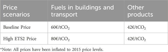 ETS2 price expectations in the literature vary greatly. According to EU ETS2, if the price of allowances exceeds €45/tCO2 (in 2020 prices, equivalent to €42/tCO2 in 2015 prices), the Market Stability Reserve (MSR) may release additional allowances to mitigate excessive price increases. Consequently, we adopt €42/tCO2 as the standard carbon price applied to all products excluding transportation and building fuels in our model.