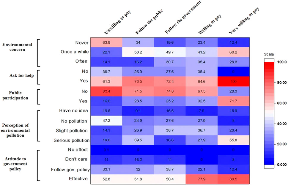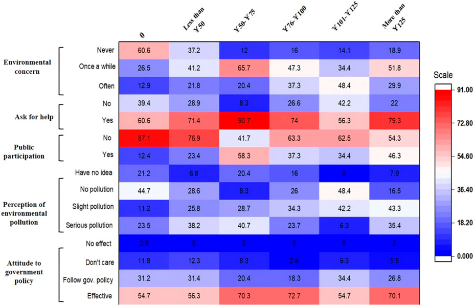 Those who were willing to pay 76–100 CNY and those who were willing to pay 101–125 CNY paid more attention to the environment and were often concerned it (37.3% and 48.4%, respectively), and most of them (74% and 56.3%, respectively) said they would seek help from others when environmental problems occurred. Their level of public participation was moderate compared to the other people.