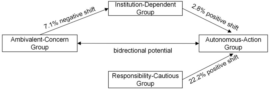 Critically, the bidirectional transitions in Figure 4 highlight how top-down policies may inadvertently reinforce dependency (e.g., high government trust but low initiative in the “dependent” group), whereas bottom-up approaches—such as local role models (e.g., volunteers’ high WTP) and participatory budgeting—could catalyze positive shifts from “wait-and-see” to “proactive” engagement.