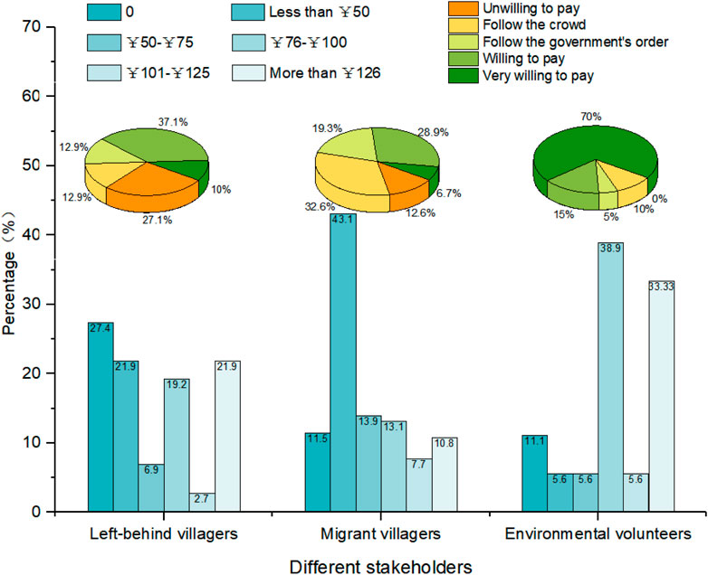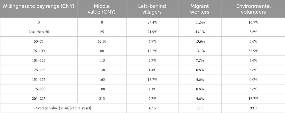 In this study, we selected the middle value of the WTP range to calculate and compare the average WTP of the different stakeholders. The results of the weighted calculation are presented in Table 5. The volunteers were willing to pay the highest average amount (99 CNY), followed by the left-behind villagers (67.5 CNY), and the migrant workers were willing to pay the smallest amount (59.5 CNY).