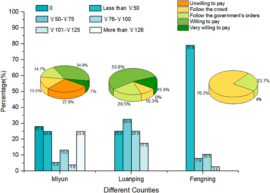 In Luanping County, 53.8% of the interviewees were willing to pay and 15.4% were very willing to pay. The proportion of people who were willing to pay ¥50–¥75 CNY was the largest. However, the stakeholders in Fengning County showed clearly no ATP. No one expressed a willingness to pay ¥0, and the vast majority of people’s ATP was <¥50 CNY.