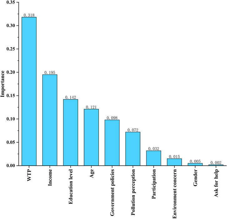 3. On the relationship between environmental concern and WTP, random forest analysis quantified this linkage, identifying WTP (importance = 0.318) and income (0.195) as dominant predictors, collectively explaining 51.3% of variance. Environmental concern, as captured through the behavioral typology, emerged as a primary driver, while socio-demographic factors (education, age, policy evaluation) played secondary moderating roles. Gender and help-seeking propensity showed negligible effects, refining our understanding of the determinants of environmental payments.