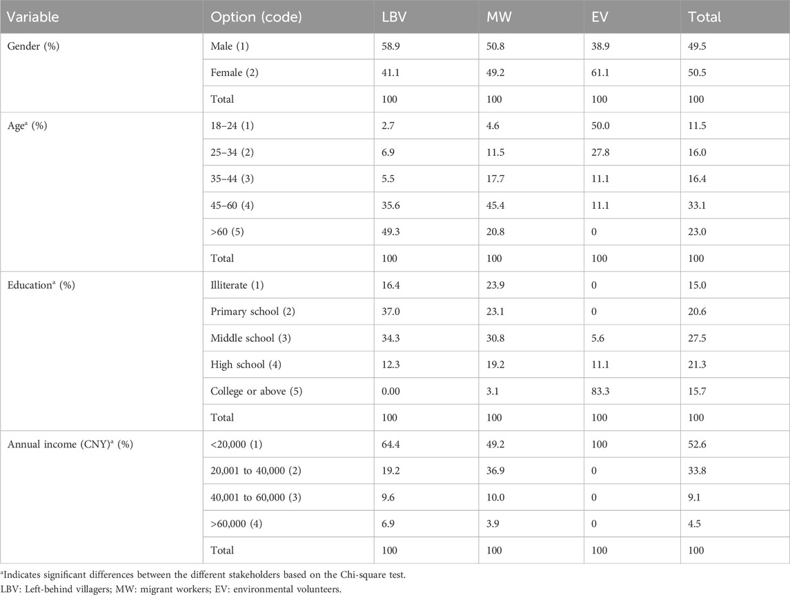 The statistics of the surveyed stakeholders are presented in Table 1. A total of 221 stakeholders participated in the survey, including 18 environmental volunteers, 73 left-behind villagers, and 130 migrant workers. The left-behind villagers stood out as being older and having a lower educational level compared to both the migrant workers and volunteers. Specifically, nearly half (50%) of the left-behind villagers were over 60 years old, and a significant proportion (87.7%) had an education level below middle school. Additionally, a substantial portion (64.4%) of the left-behind villagers and half (50%) of the migrant workers earned an annual income of less than 20,000 CNY ($3,011). The environmental volunteers were younger and had a higher education level. The average annual income of all of the volunteers was less than 20,000 CNY ($3,011).
