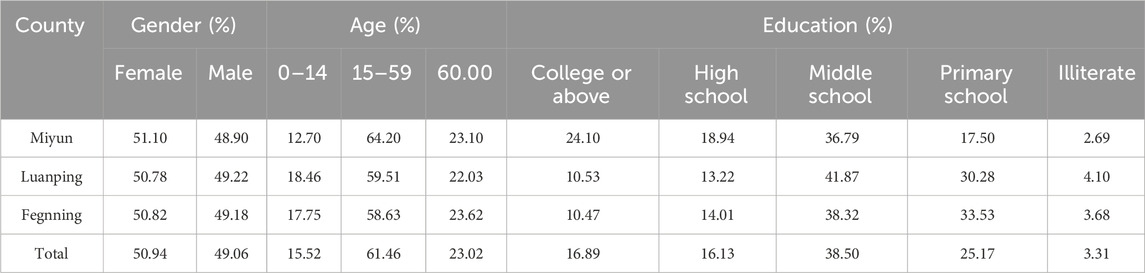 Comparative analysis between the sampled populations from three counties and the general population (Table 2) revealed demographic alignment in sex ratio. However, due to the limited age stratification in the Statistical Yearbook, only the proportion of individuals aged ≥60 years could be validated against population-level data. Notably, a higher illiteracy rate was observed in the sample (23%) compared to the general population (3.31%), likely attributable to the overrepresentation of older left-behind villagers in the surveyed cohort. Despite this discrepancy, these individuals constitute the core residents and grassroots managers of rural communities, playing a pivotal role in rural governance and development. The predominance of junior high school education levels in both the sample and population further supports the representativeness of the study cohort.