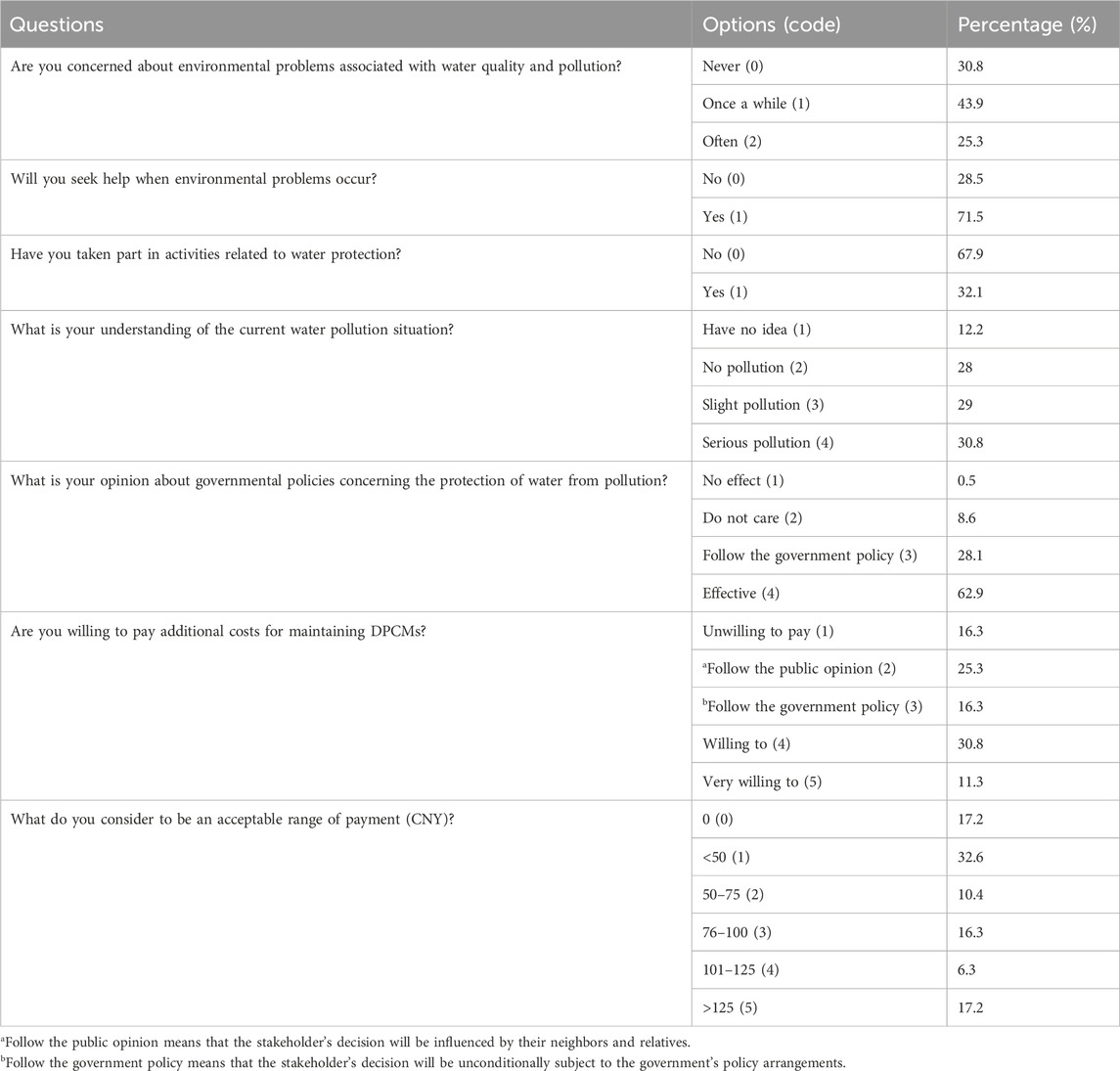 The results of the statistical analyses are presented in Table 3. It was found that 25.3% of the stakeholders were often concerned about the water quality and pollution problems, 30.8% were not concerned, and 43.9% were occasionally concerned. Most of the interviewees (71.5%) reported that they would seek help when environmental problems arose. About 32% of the stakeholders had participated in water protection activities. Interestingly, 62.9% of the stakeholders thought that the governmental policies to protect water were effective, and 28.1% did not question the government policies. Concerning payment, 16.3% of the stakeholders were unwilling to pay for DPCMs. Those who were neither willing nor unwilling to pay either followed the government policy (16.3%) or the public opinion (25.3%) without a strong individual opinion. According to the survey results, 30.8% of stakeholders clearly expressed that they were willing to pay; and 11.3% were very willing to pay for DPCMs. In terms of the WTP, only 23.5% of the stakeholders can accept an amount equivalent to 1% of the per capita disposable income (i.e., 113 CNY) or above (Table 2). Most of the stakeholders’ WTP was lower than the given value. Specifically, 32.6% were willing to pay less than 50 CNY, and 10.4% were willing to pay between 50 CNY and 75 CNY. Only 17.2% reported that they were not willing to pay.