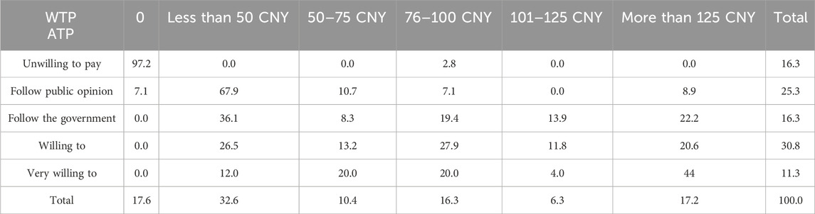In this study, it was assumed that the attitude toward paying represents a verbal promise, while the WTP represents practical action. Although not strongly prevalent, this phenomenon was observed in our study. However, it should be noted that some respondents expressed willingness to pay in principle but ultimately reported a payment amount of zero. This represents a willingness to pay but a change of mind in the context of the payment amount involved. These people are mainly environmental volunteers, among whom 11.1% (2 people) expressed willingness to pay to follow the public opinion, but the amount of payment was ¥0. The general situation in China is that the public is concerned about the outcome of environmental management but has no understanding of the policy-making process and how to participate in governance. This leads to high environmental concerns and low participation (Li, 2018). This is why the verbal promises and practical actions of some stakeholders’ are inconsistent; that is, an increase in pro-environmental awareness does not always yield consistent pro-environmental activity (Du et al., 2019; Wang et al., 2010). An ambivalent attitude reflects the simultaneous existence of positive and negative dispositions (Costarelli and Colloca, 2004) toward the WTP, which is a strong predictor of behavioral intentions.