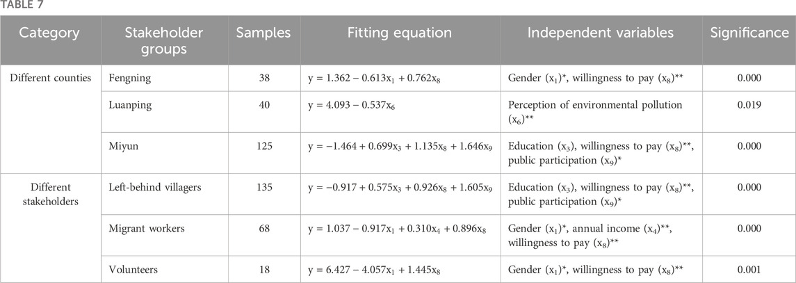The regression analysis results (Table 7) reveal that various factors affected the WTP among the stakeholders in the different counties. Specifically, the factors influencing the WTP varied across the counties. In Fengning County, a positive attitude toward paying was associated with a higher payment amount. Conversely, gender had a negative influence, with women demonstrating a lower WTP compared to men. In Luanping County, a perception of severe environmental pollution negatively affected the WTP, i.e., those who perceived the pollution to be more severe were willing to pay less. Notably, those who believed that those who cause the pollution should pay tended to have a corresponding attitude toward their WTP as the pollution severity increases. In Miyun County, both the education level and public participation positively influenced the WTP, with a higher education and greater involvement in public activities corresponding to higher WTP.
