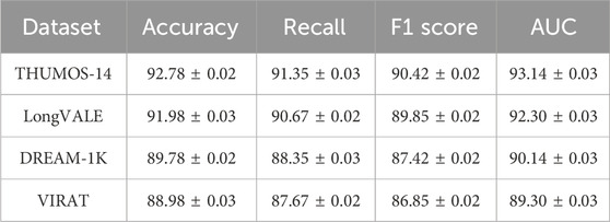 Tables 1 provides a comparative analysis of our proposed method against several state-of-the-art (SOTA) approaches across four benchmark datasets: THUMOS-14, LongVALE, DREAM-1K, and VIRAT. Our approach consistently outperforms prior methods across all evaluation metrics, including accuracy, recall, F1 score, and AUC. On the THUMOS-14 dataset, our method achieves an F1 score of 90.42%, exceeding BLIP by 2.30%. Likewise, on the LongVALE dataset, our model attains an F1 score of 89.85%, surpassing the previous best-performing model by 1.95%. These findings demonstrate the strong generalization capability of our method across diverse domains and entity types.